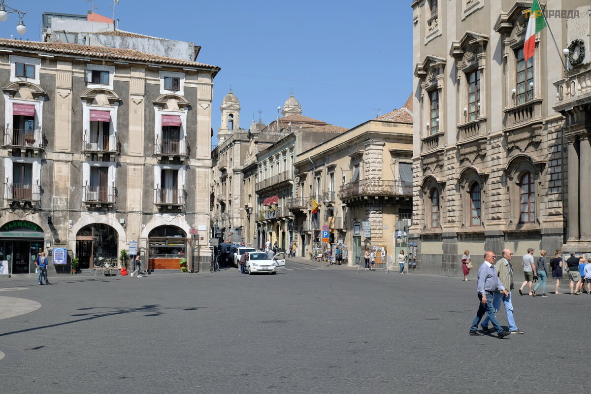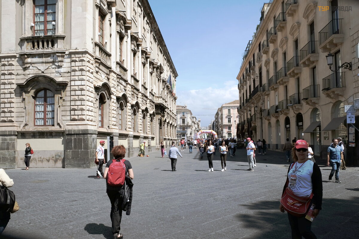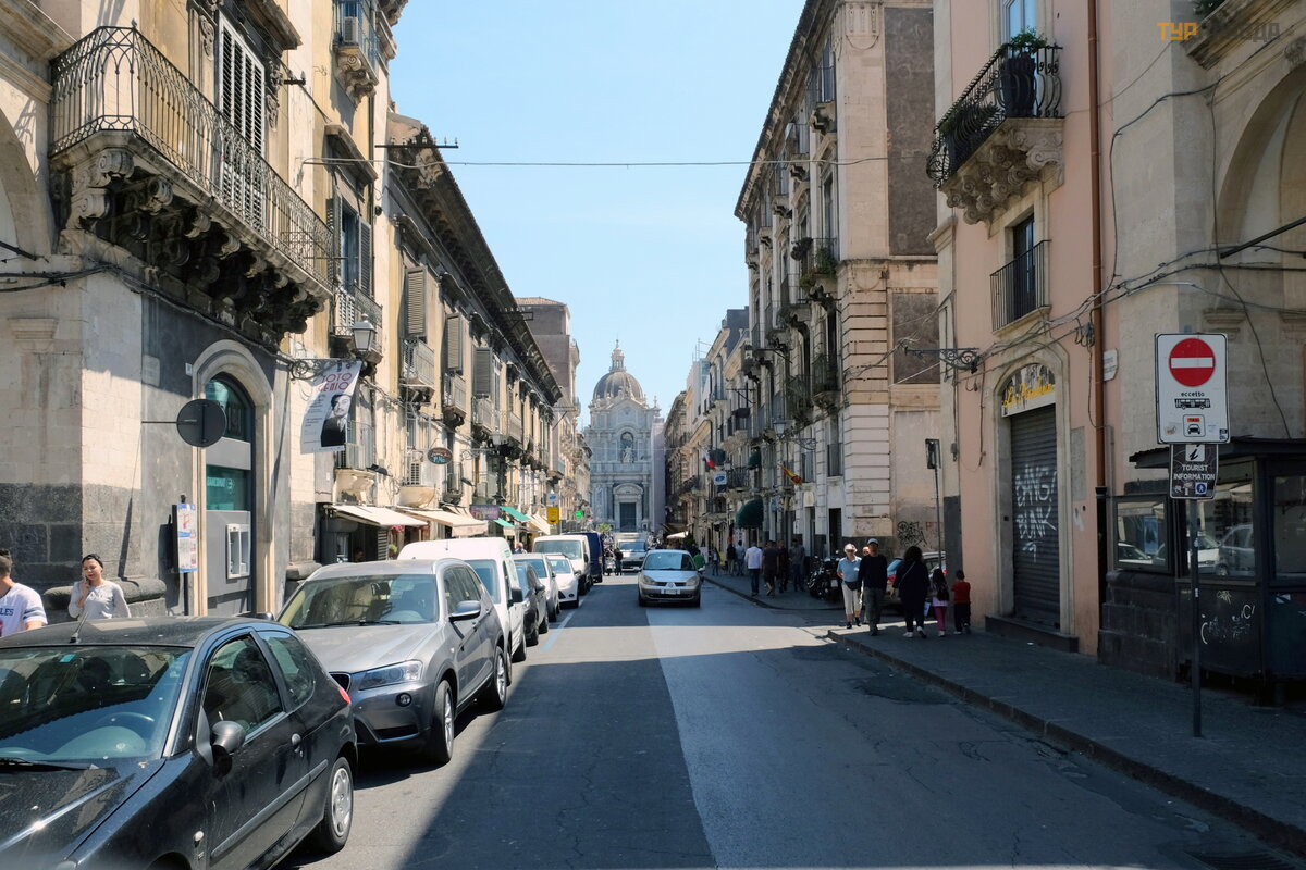 Eikime į pagrindinę Katanijos aikš tę , č ia Via Etna stač iu kampu susikerta su kita centrine miesto gatve Via Vittorio Emmanuel II.
