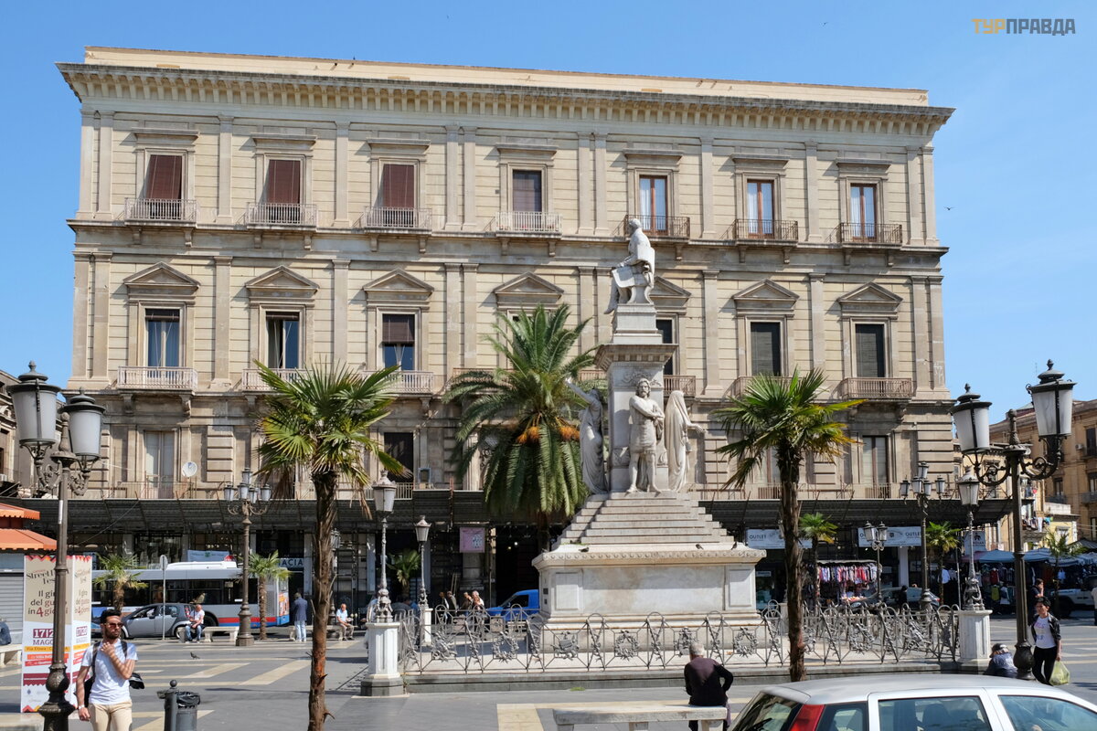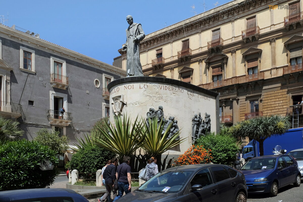 Paminklas Katanijos kardinolui ir arkivyskupui Giuseppe Benedetto Duzmet (1867–1894). Paminklo kairė je yra trijų aukš tų pastatas iš vulkaninio akmens, statytas XVIII amž iaus pradž ioje.
