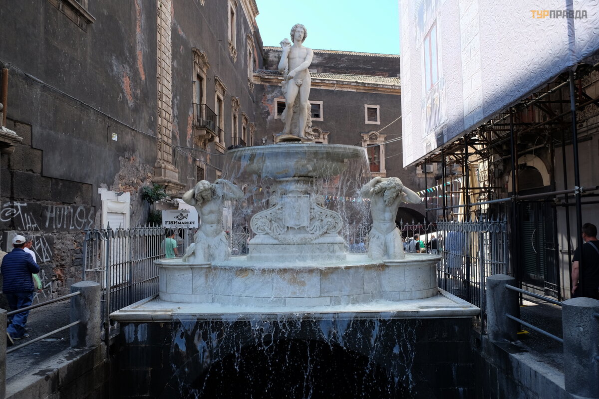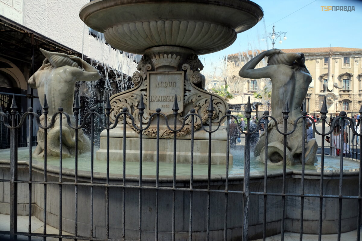 Duomo aikš tė s pakraš tyje yra kitas Amenano fontanas (1867 m. ). Centrinė je fontano skulptū roje pavaizduotas Amenano upė s dievas (dabar Amenano upė teka dviejų metrų gylyje po ž eme). Vė sus š ios upė s vanduo trykš ta iš fontano Katedros aikš tė je prie paminklo su drambliu. Katanijos gyventojai jį vadina fontana dell'acqua a linzolu – „paklodo formos vandens fontanu“.