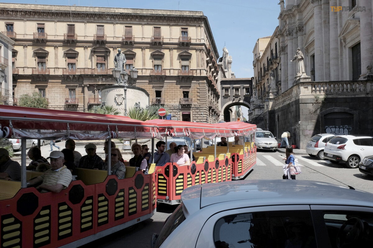 Kitą dieną , ryte, iš vykome į Kataniją . Autobusų bendrovė "ETNA Trasportie Interbus". Bilietas pirktas paviljone stoteleje, jei vezi pirmyn atgal, tai pelningiau, vienas bilietas kainavo apie 7 eurus. Kelionė s laikas nefiksuotas, autobusas jau atvaž iuoja su keleiviais iš Taorminos, intervalas priklauso nuo sezono, tada buvo apie valanda, vairuotojas į leidž ia keleivius, jei yra tuš č ių vietų . Ryte autobusas buvo pustuš tis, o mes važ iavome keturiasdeš imt minuč ių iki Katanijos autobusų stoties. Pač iame mieste autobusas daro dar keletą stotelių , todė l galima nuvykti į konkreč ią vietą .