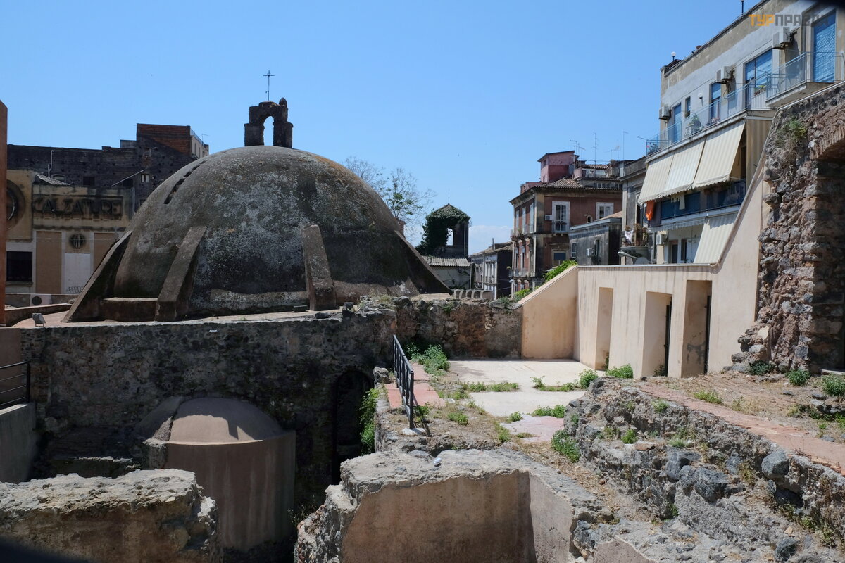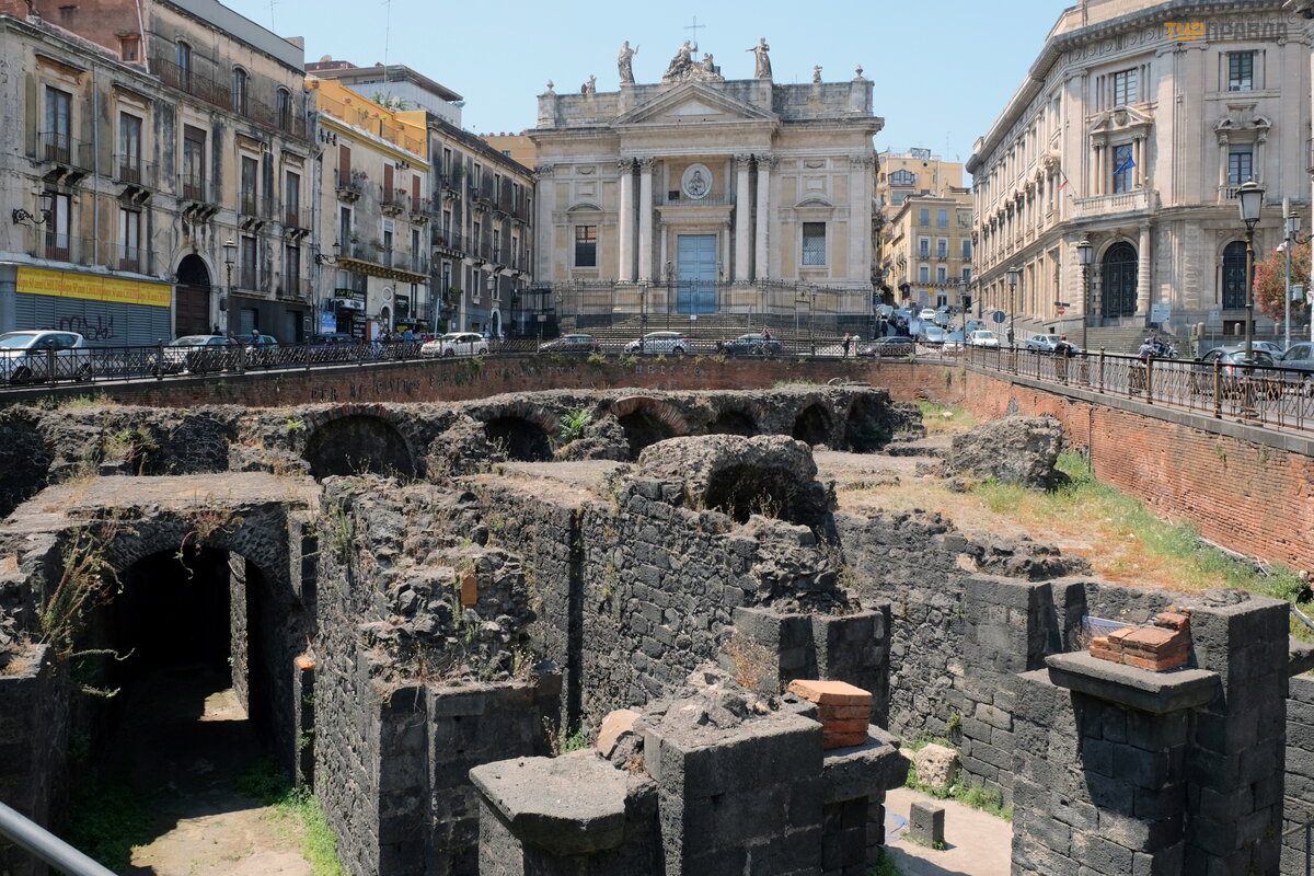Š is didž iulis pastatas yra Š v. Mikalojaus baž nyč ia (Chiesa di San Nicolò l'Arena), didž iausia baž nyč ia Sicilijoje. Baž nyč ia buvo ne kartą perstatyta, tač iau dė l lė š ų stokos taip ir nebuvo baigta.