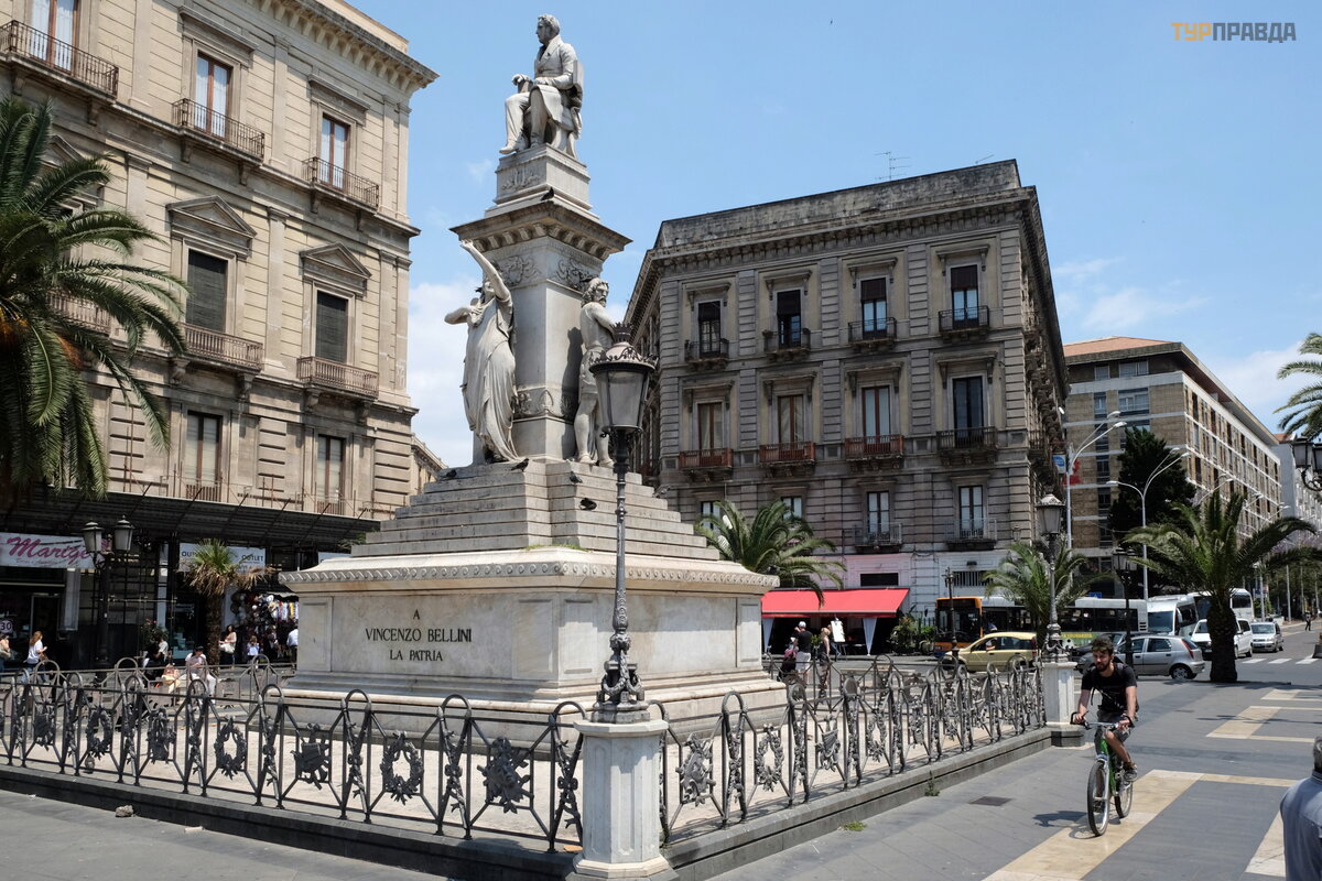 Pravaž iuojame pro aikš tę su Vincenzo Bellini paminklu, č ia sugrį š ime.