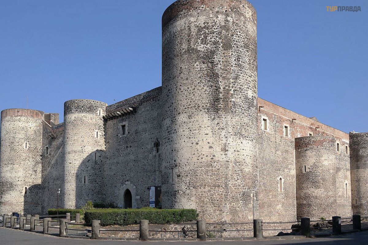 Vienintelis iš likę s pastatas š iuose kataklizmuose yra galinga XIII a. Castello Ursino. Jo sienos ir bokš tai nesugriuvo, ant mū ro iki š iol matomi magmos pė dsakai. Kai buvo pastatyta pilis, ji stovė jo ant uolos su vaizdu į Jonijos jū rą , tač iau š iandien dė l Etnos iš siverž imų ir daugybė s ž emė s drebė jimų ją nuo pakrantė s skiria visas kilometras. Pilies sienose dabar yra istorijos muziejus.