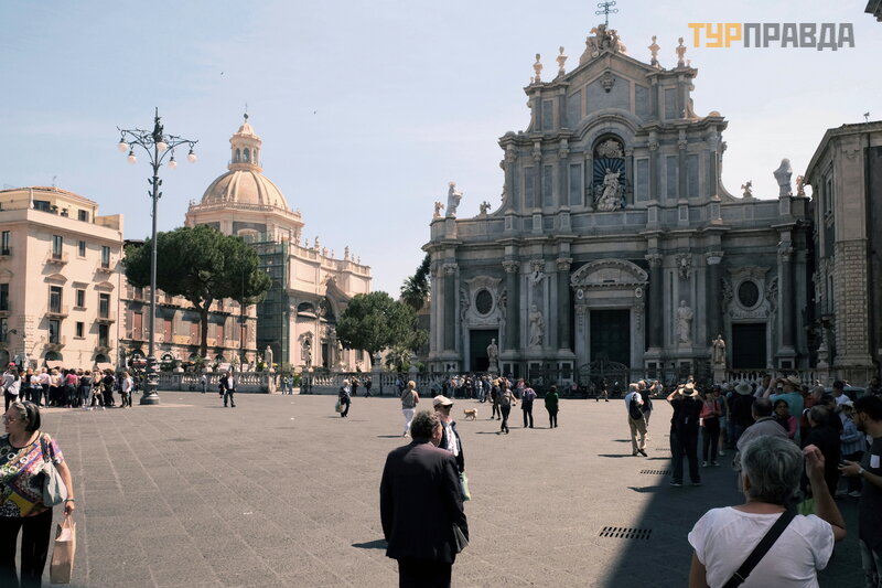Aikš tė s centre yra Katanijos katedra (1739 m. ), Š v. Agatos katedra (Cattedrale di Sant'Agata), miesto, Sicilijos ir Maltos globė ja. Š ventykla buvo pastatyta XII amž iaus pabaigoje ant ž emė s drebė jimo sugriauto romė nų pastato griuvė sių . Per pamaldas po katastrofiš ko 1693 m. ž emė s drebė jimo po savo griuvė siais buvo palaidota 7000 besimeldž ianč ių pilieč ių . Ji buvo kelis kartus perstatyta, š iandieninius katedros fasadus ir interjerus baroko stiliumi puoš ia Vaccarini.