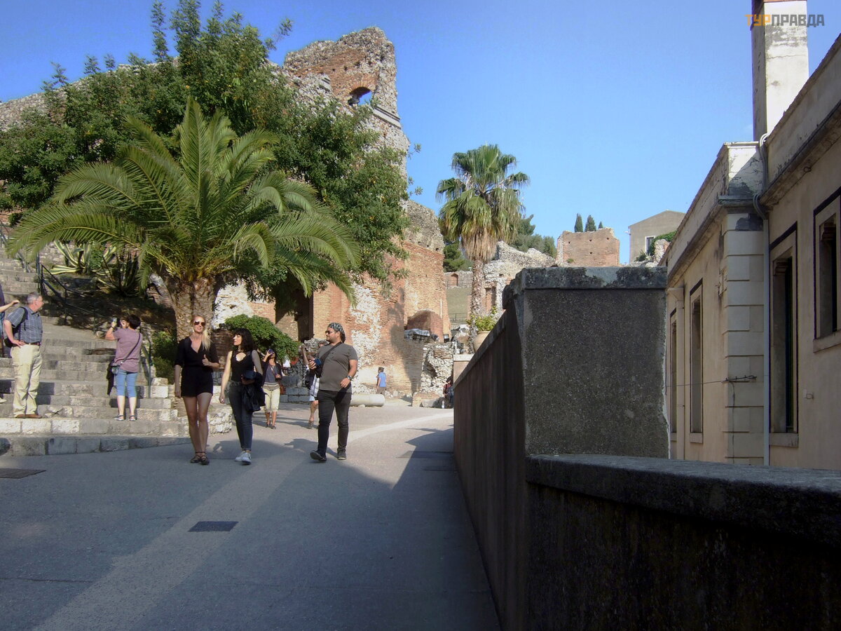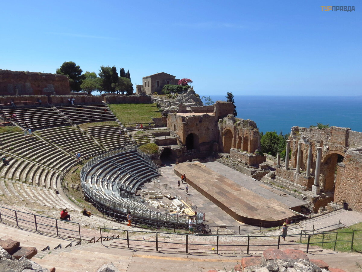 Teatras buvo pastatytas III amž iuje prieš Kristų . e. , teatro, skirto 1.000 ž iū rovų , skersmuo buvo 109 metrai. 2017 metais ten vyko G7 vadovų susitikimas. Apsilankymo teatre kaina 10 eurų . Bet į vidų ten nė jome, kainą į vertinome per aukš ta, vaizdai į apylinkes ir nuo Taorminos graž ū s, be to, neseniai Graikijoje matė me kelis panaš ius teatrus. Kad vaizdas bū tų baigtas, į dedu teatro nuotrauką iš interneto. Š alia teatro yra miesto parkas.
