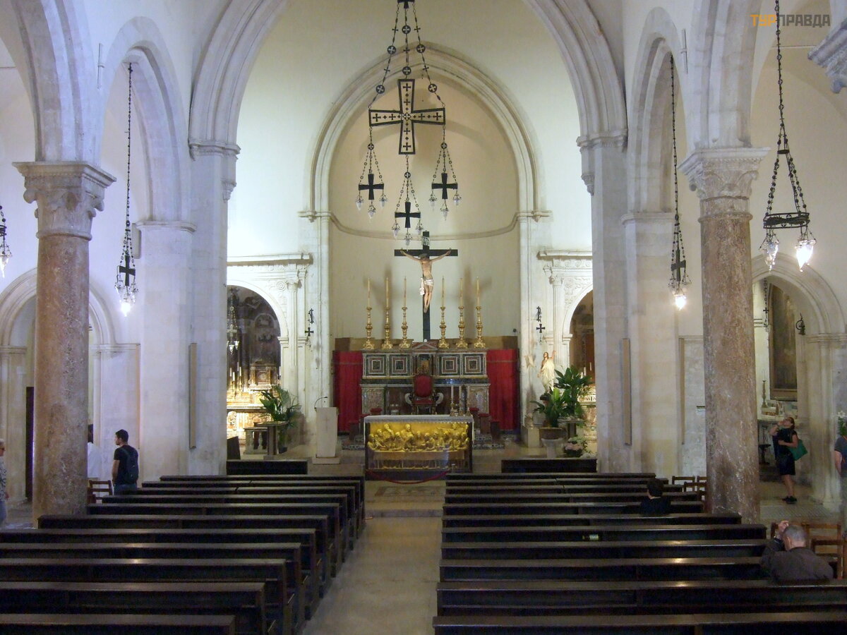 Š v. Mikalojaus katedra (Dom San Nicolò ), kuri atrodo kaip tvirtovė , yra Duomo aikš tė je. Katedra, pastatyta XIII amž iuje, yra viduramž ių architektū ros ir baroko elementų miš inys, kuris buvo pridė tas prie originalaus pastato XVII a.
