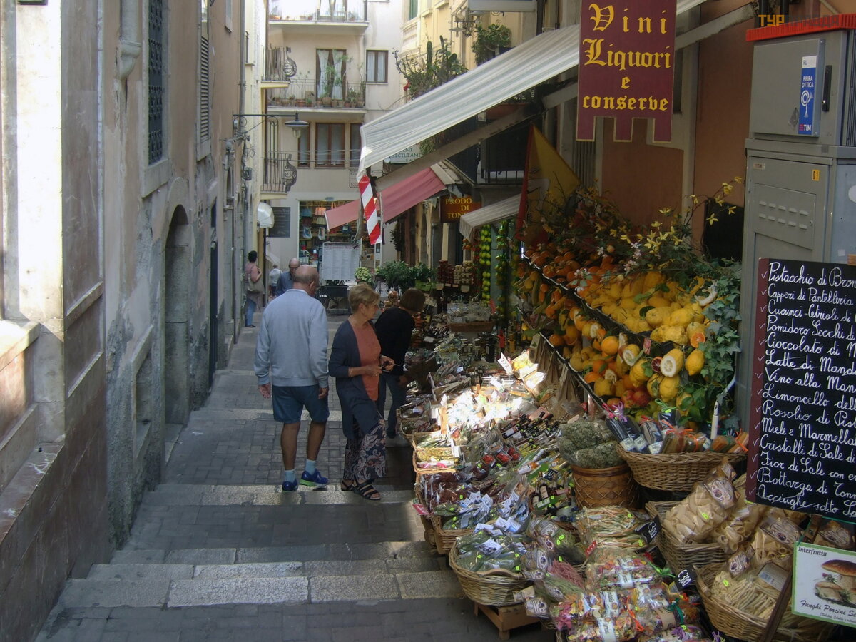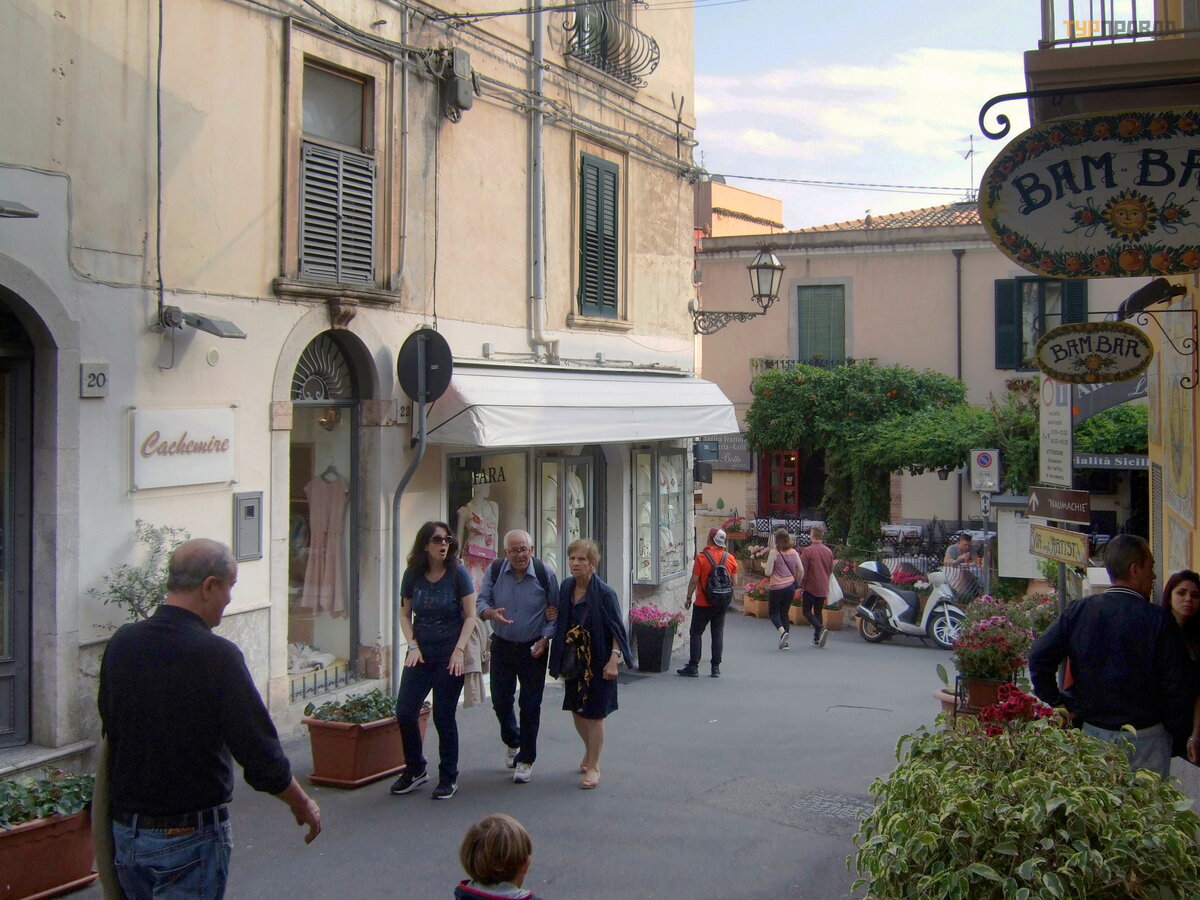 Š eš tadienį Giardini Naxos mieste, netoli nuo mū sų vieš buč io, buvo turgaus diena, tada prieš pietus dar pasivaikš č iojome po miestą . Po pietų ir maudynių baseine iš vykome į Taorminą . Yra nemokami pervež imai iš vieš buč io pirmyn ir atgal, tik reikia iš anksto už siregistruoti registratū roje. Galima važ iuoti ir miesto autobusu, kaina 1.3 euro, važ iuoti reikia apie 25 min. , nes autobusas turi daug stotelių palei Giardini Naxos gatves.