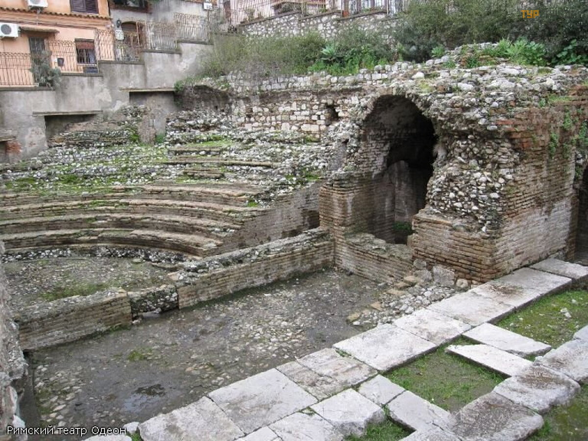 Eidami toliau Corso Umberto, pamatysime kitą senovė s Romos paminklą – Odeoną , maž o senovė s romė nų amfiteatro, skirto 200 ž monių , liekanas. Jis buvo pastatytas prieš mū sų erą Augusto Oktaviano už sakymu.