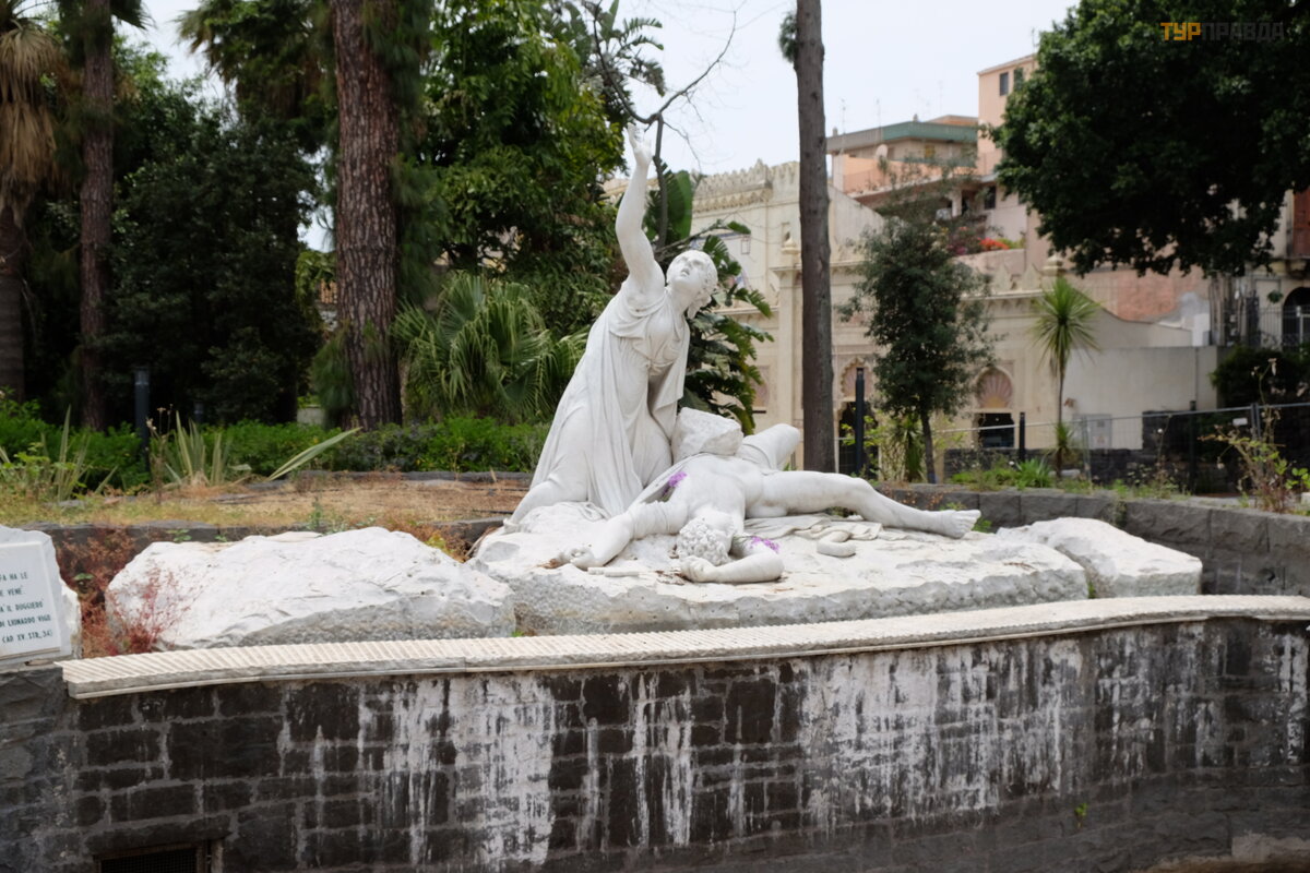 Prie į ė jimo yra vonios formos fontanas, kurio pakraš tyje tarsi ant jū ros kranto Galatė ja aprauda nuž udytą Ač į Pereku: