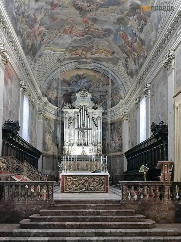 Katedros viduje yra graž ių Pietro Vasta, Francesco Mancini ir Giacinto Palatania freskų ir paveikslų .