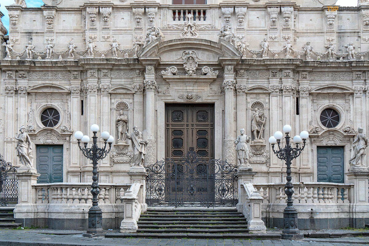 Baž nyč ios prieangį juosianč ią baliustradą.1754 m. padarė meistras Giovanni Battista Marini pagal Acirealė s kilusio, puikaus architekto ir menininko Pietro Paolo Vasta projektą , ant jo yra deš imt statulų , vaizduojanč ių baž nyč ios didvyrius. Senasis Testamentas.