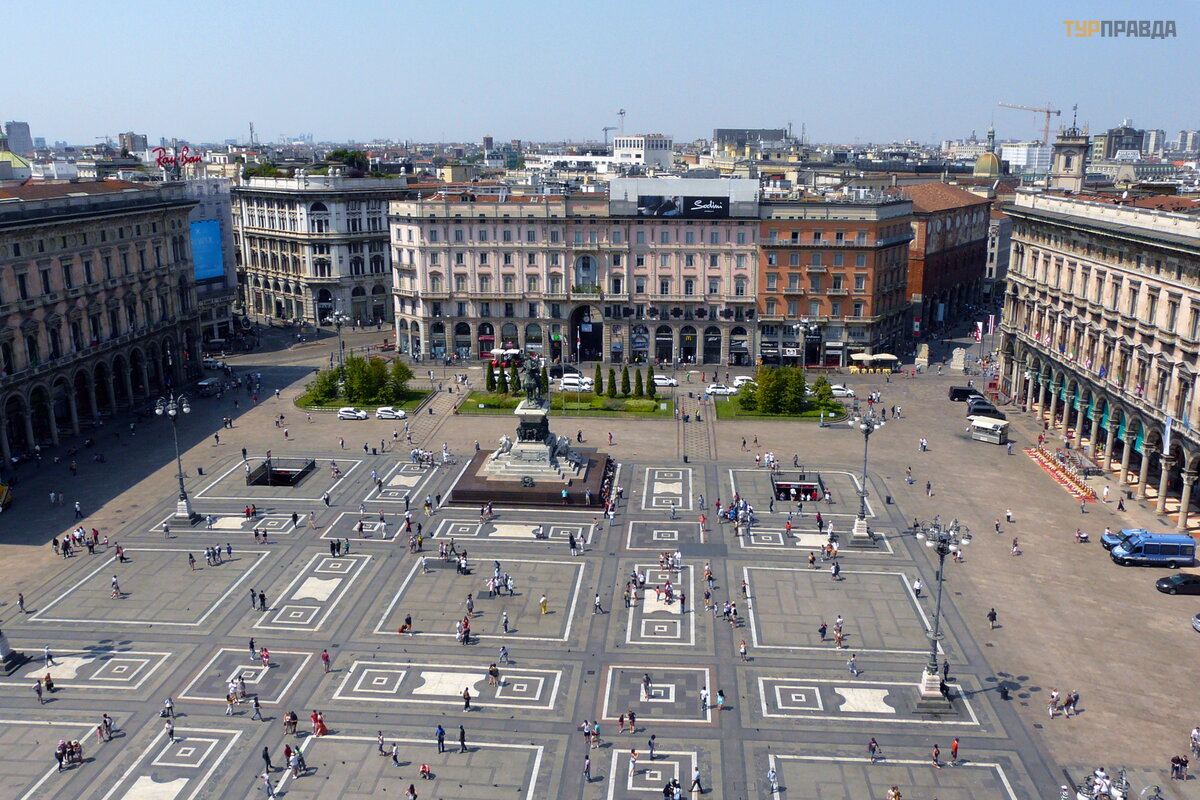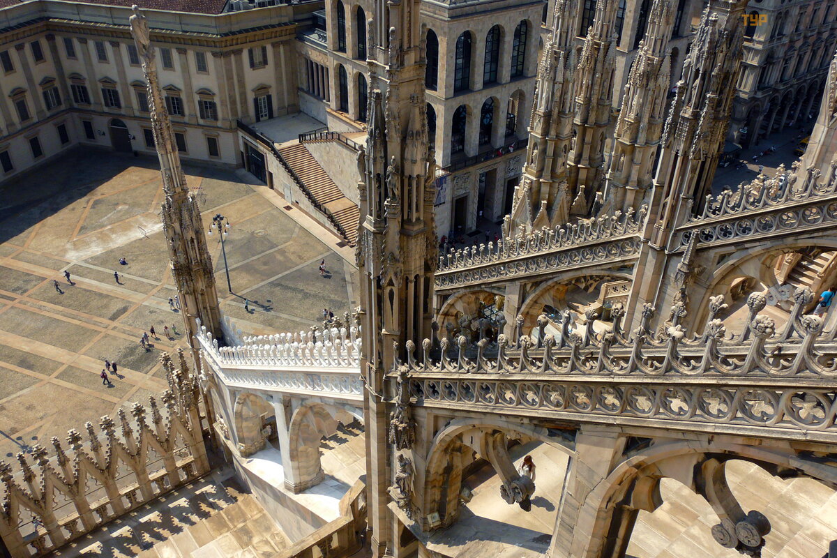 Nuo stogo galite mė gautis kvapą gniauž ianč ia aikš tė s prieš ais katedrą – Piazza del Duomo – panorama. Su paminklu Vittorio Emanuele II centre, Karališ kaisiais rū mais kairė je (dabar yra Valstybinis modernaus meno muziejus ir Duomo katedros muziejus) ir Galleria Vittorio Emanuele II deš inė je. Arba atvirkš č iai, jei stovite veidu į į ė jimą į katedrą . : )