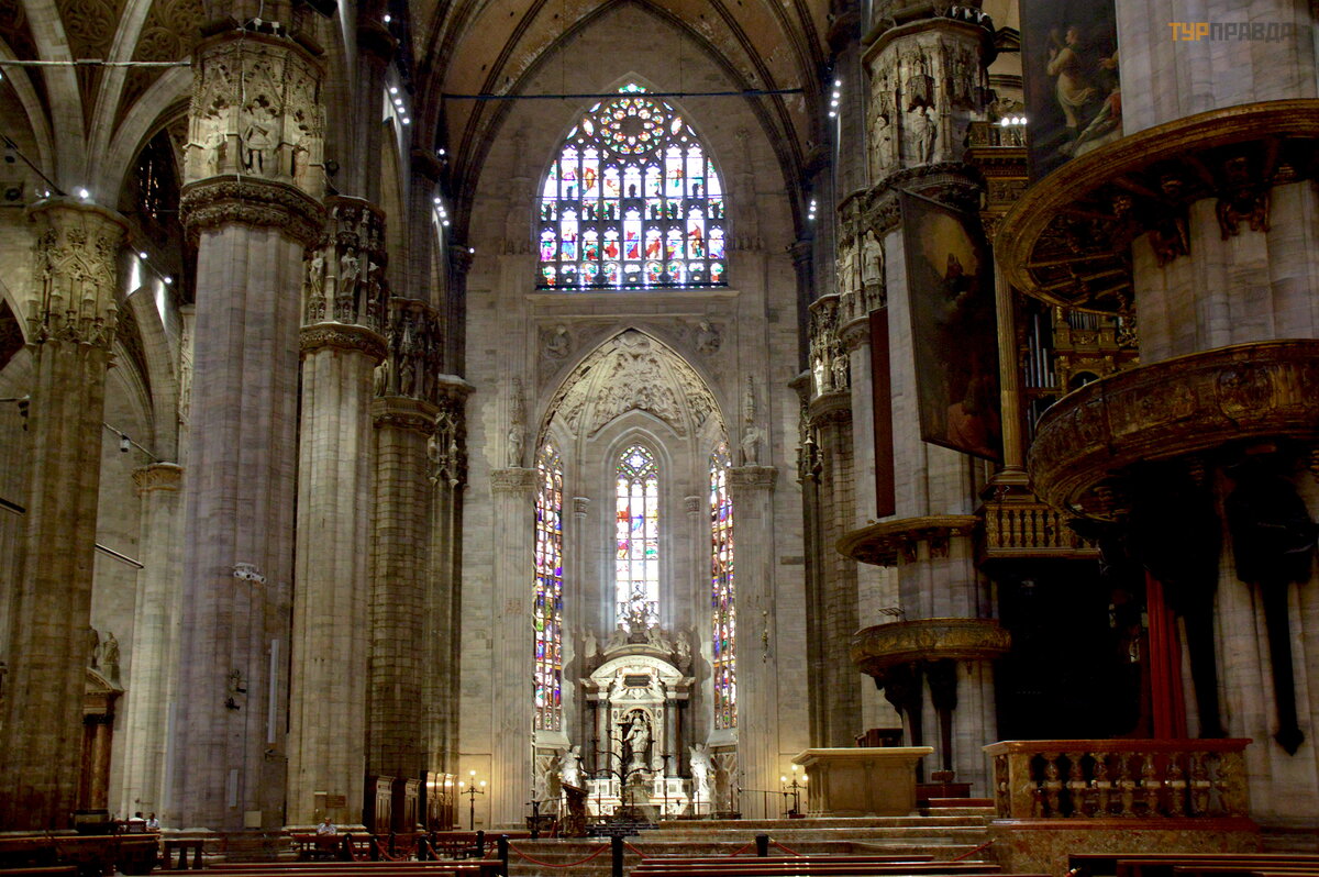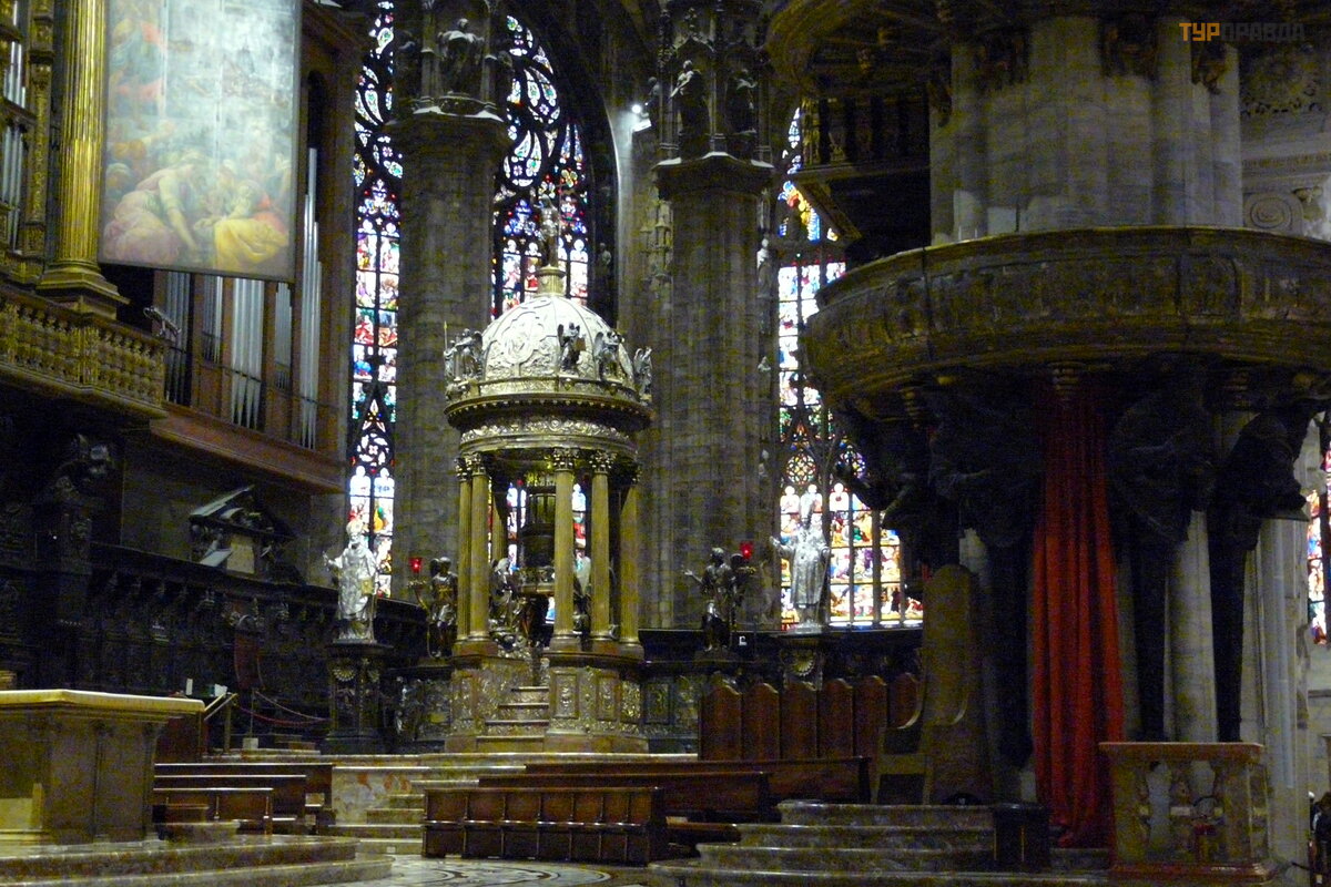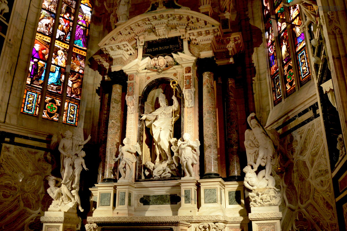 Č ia, po katedra esanč ioje kriptoje, palaidotas Katalikų baž nyč ios š ventuoju paskelbtas Carlo Borromeo. Netoliese yra ir lobių skrynia. Nepaisant papildomo mokesč io už į ė jimą į kriptą , č ia visada susidaro eilė .