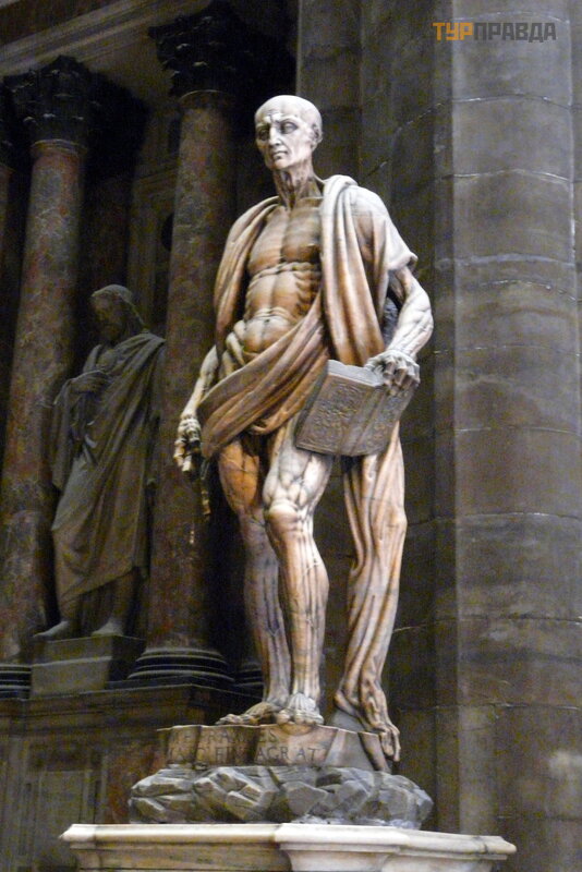Kita katedros relikvija yra Š v. Baltramiejaus statula, kuriam romė nai gyvam nulupo odą . Š i oda yra už dengta Baltramiejaus kaip apsiaustas. Pirmo apsilankymo metu tai man padarė skaudų į spū dį – skulptū ra yra š alia š oninio į ė jimo gana š viesioje vietoje, kuri leidž ia matyti visą figū ros anatomiją . Bet š į kartą nusprendž iau nusifotografuoti. : )