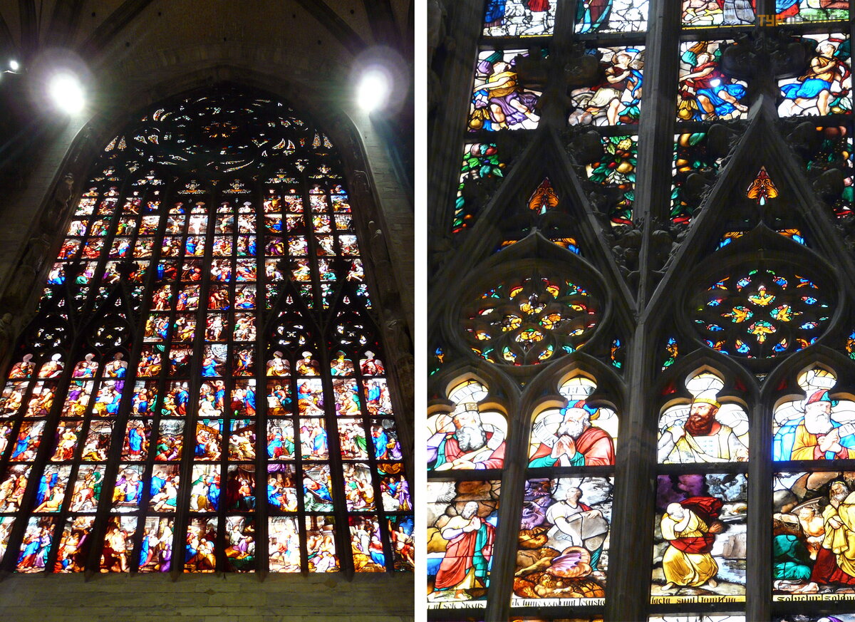 Katedros vidus tamsus, iš pirmo ž vilgsnio net niū rus. Pro prabangius vitraž us (seniausias datuojamas 1473 m. ), vaizduojanč ius Biblijos scenas ir š ventų jų gyvenimus, prasiskverbia tik saulė s spinduliai.