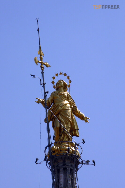 O ant aukš č iausios smailė s virš miesto iš kyla auksinė Milano globė jos Madonos figū ra.