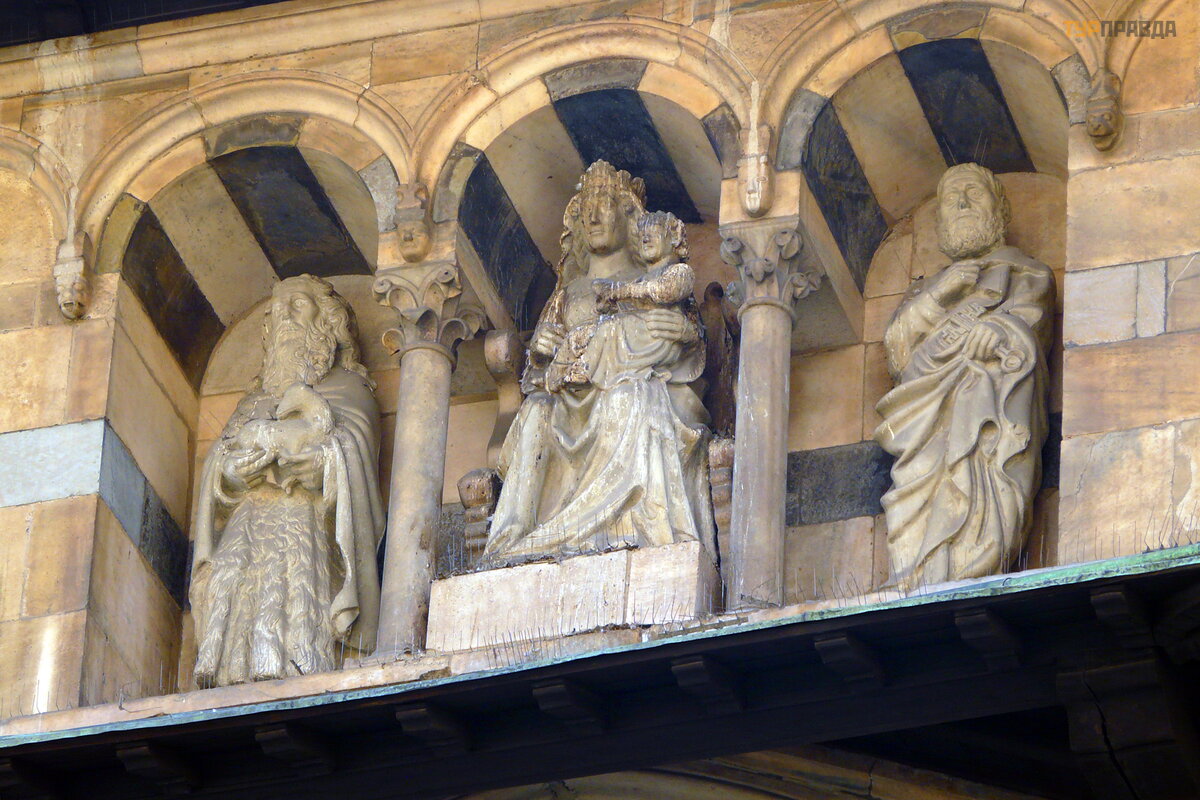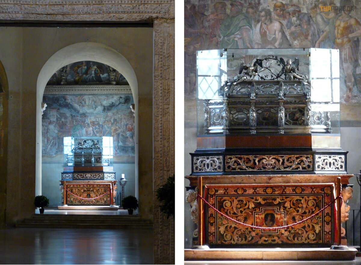Уже на выходе из базилики мы услышали русскую речь и увидели небольшую группу туристов, которые куда-то спускались слева от алтаря. Тихонько последовав за ними, мы оказались в крипте, где в серебряной раке покоились три скелета, облаченных в богатые одежды – мощи святых Амвросия, Протасия и Гервасия. К сожалению, услышав, что мы тоже говорим на русском языке, гид быстро прекратила рассказывать историю « экспонатов» и вывела группу наверх.