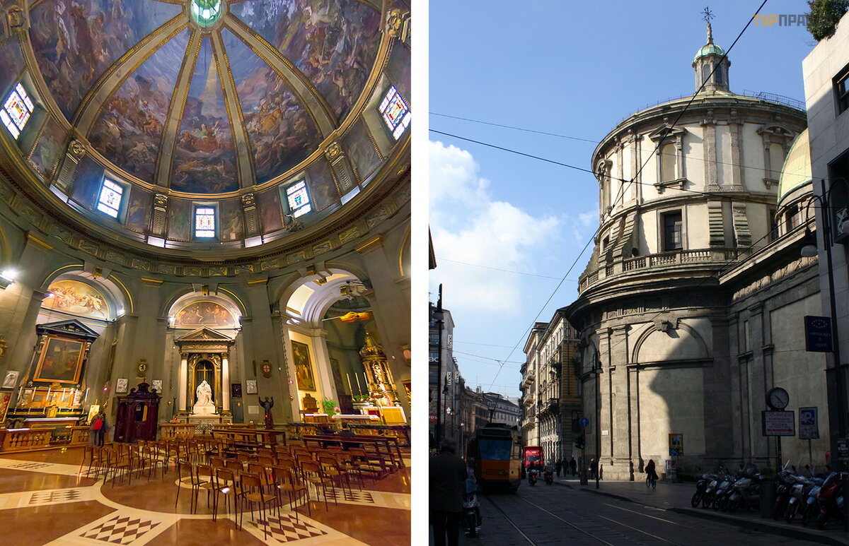 Проходя по Виа Торино, справа замечаем круглое здание Храма Сан-Себастьяно (Civico Tempio di San Sebastiano). Этот храм был построен по заказу все того же святого Карла Борромео в память о жертвах чумы 1576 года (святой Себастьян считался защитником от моровых болезней). К сожалению, храм оказался закрытым.