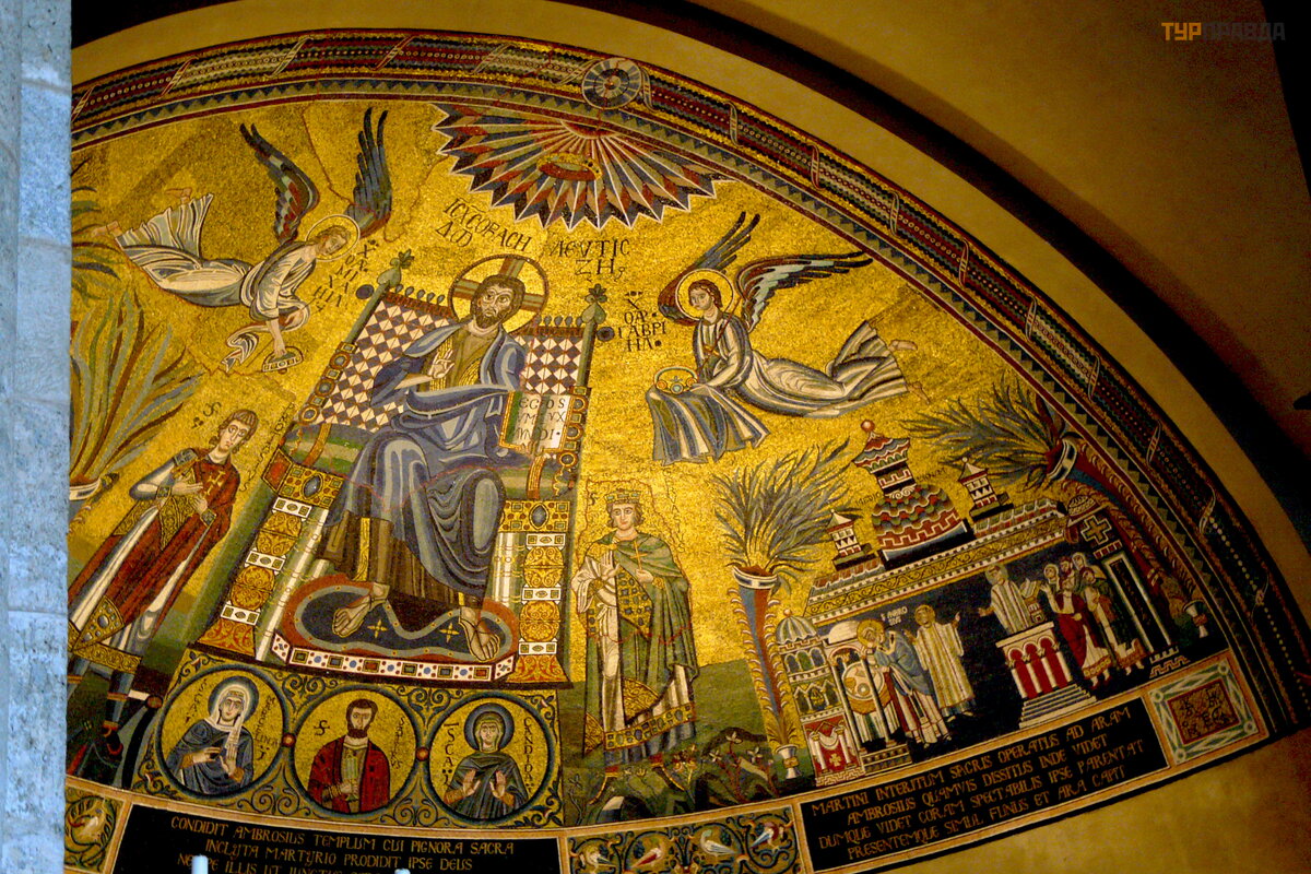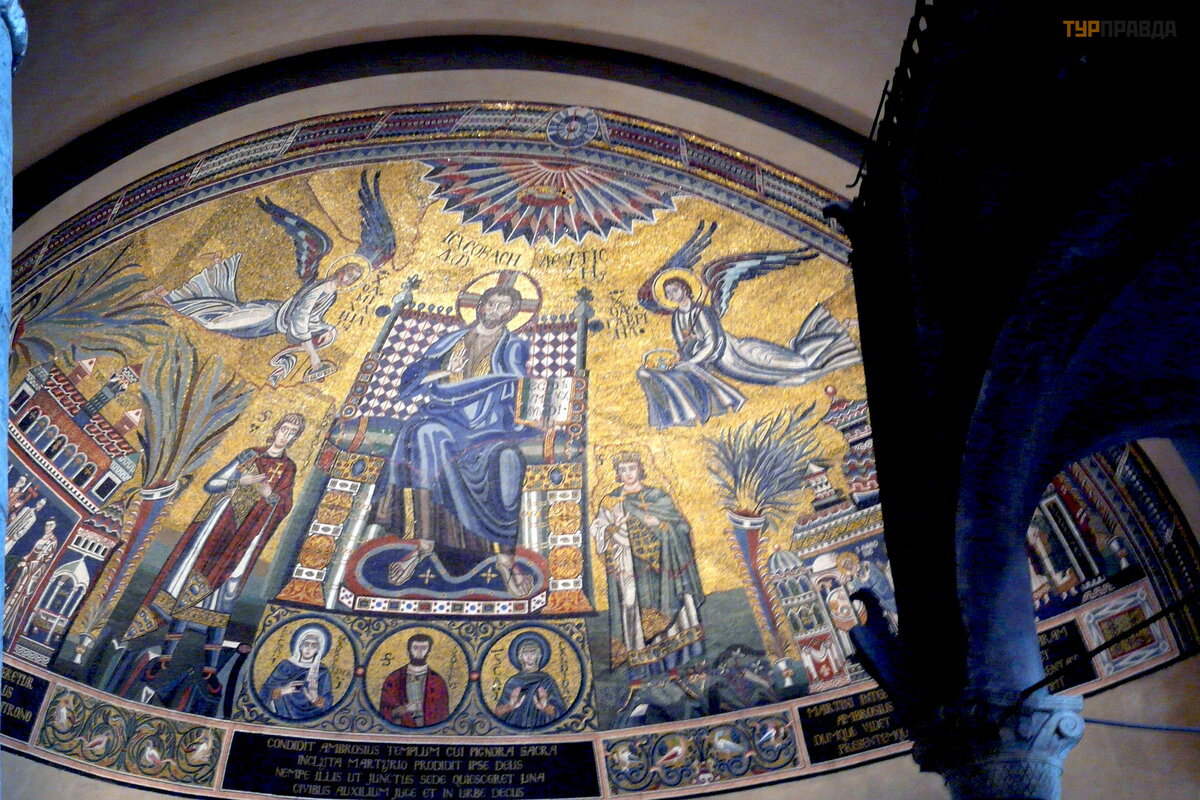 На территории базилики находится капелла Сан-Витторио-ин-Чиель-д' Оро (San Vittore in Ciel d’ Oro), известная своей золотой мозаикой V века. Вход в нее – справа от алтаря. В вход капеллу платный, 2 евро. У входа сидел итальянский дедушка, который с явным удовольствием показал куда заходить, на что обратить внимание, да и просто готов был пообщаться. Жаль, никто из нас не понимал итальянского языка. : ( Сама капелла была великолепная – уникальный мозаичный купол, роскошные росписи на стенах и сводах, сокровищница с христианскими реликвиями, ажурные решетки, – все настолько восхитило, что не хотелось уходить. Но надо было. День подходил к концу, и на оставшиеся запланированные памятники итальянской истории оставалось не так уж много времени.