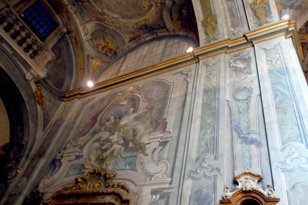 Войдя через центральные ворота базилики, мы оказались в небольшом дворике – атриуме. Простой классический фасад церкви настраивал на аскетичное внутреннее убранство. Но то, что мы увидели, поразило нас своим великолепием настолько, что мы несколько раз обошли церковь, бесконечно рассматривая и фотографируя каждый элемент.
