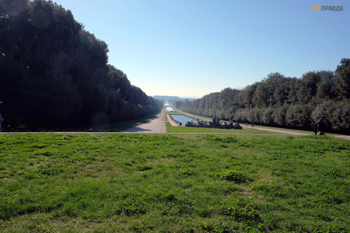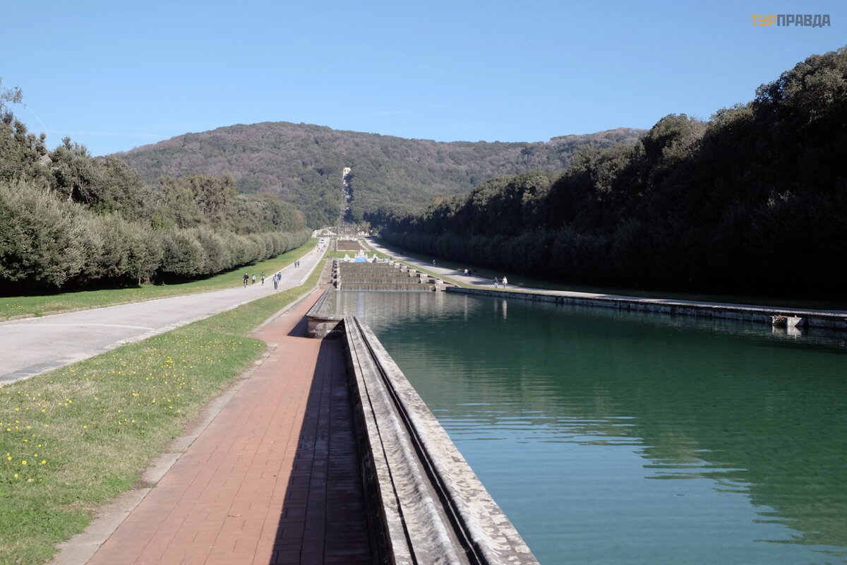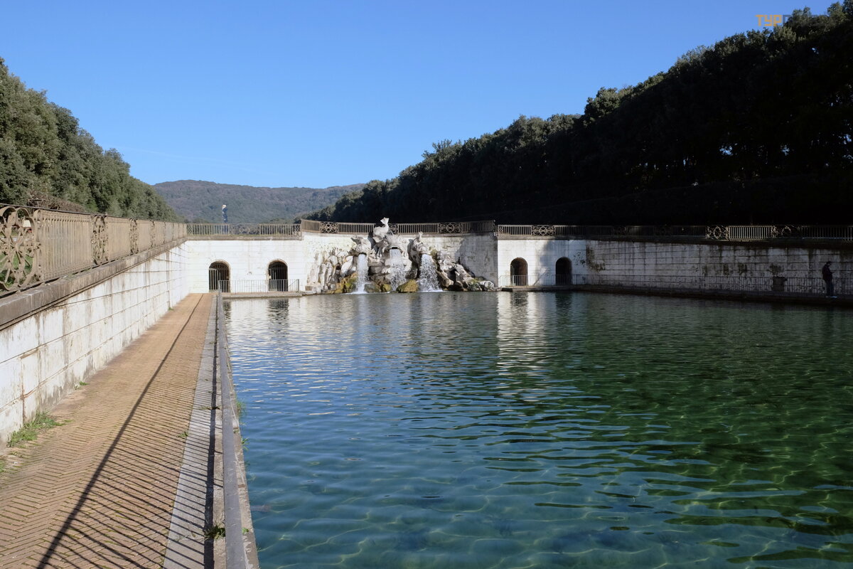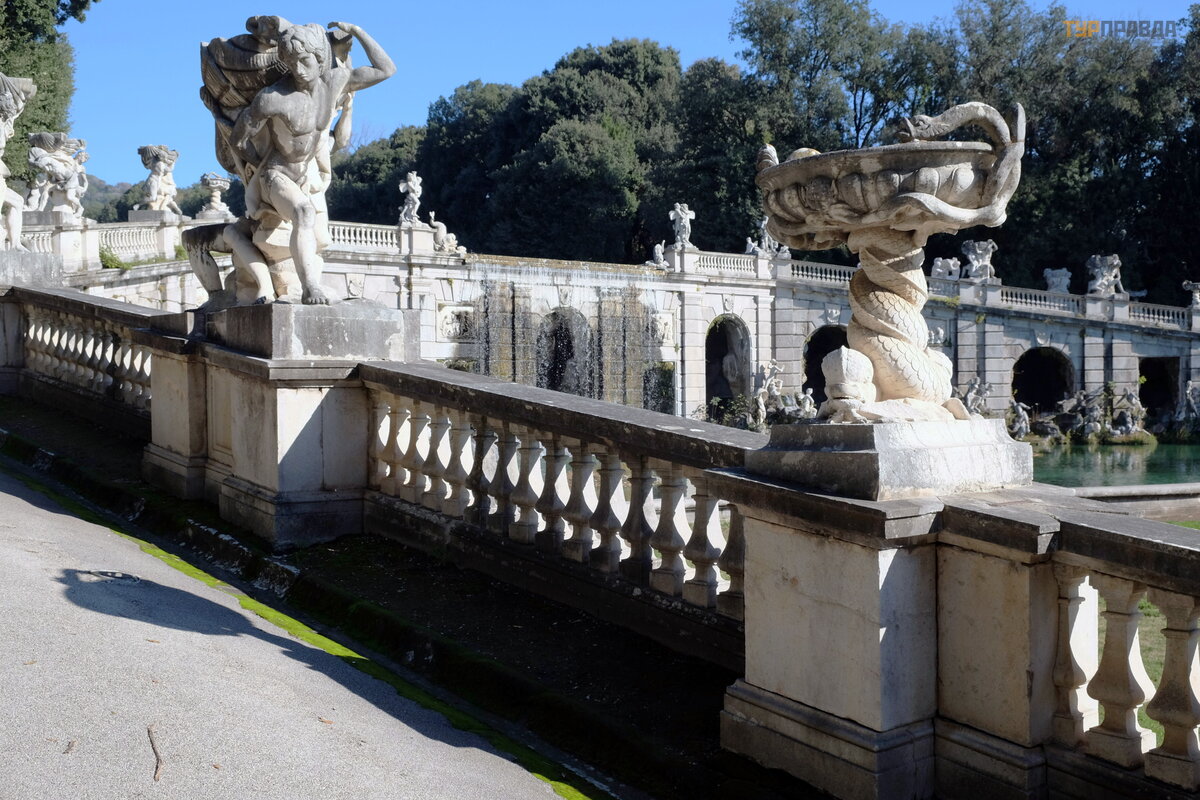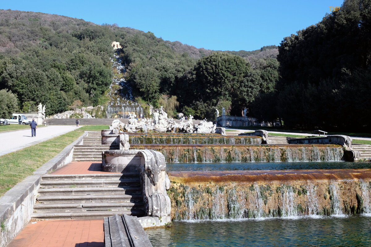 Artcard kasoje gavę bilietą , pirmiausia nuė jome apž iū rė ti parko su fontanais (jei tik yra jė gų ir nė ra taip karš ta). Siekdamas tiekti vandenį iš kalnų fontanams, Vanvitelli pastatė grandiozinį akveduką . Tie. vanduo teka nuo kalno link rū mų . Kelias nuo rū mų iki kalno yra 3 km ir į kalną .