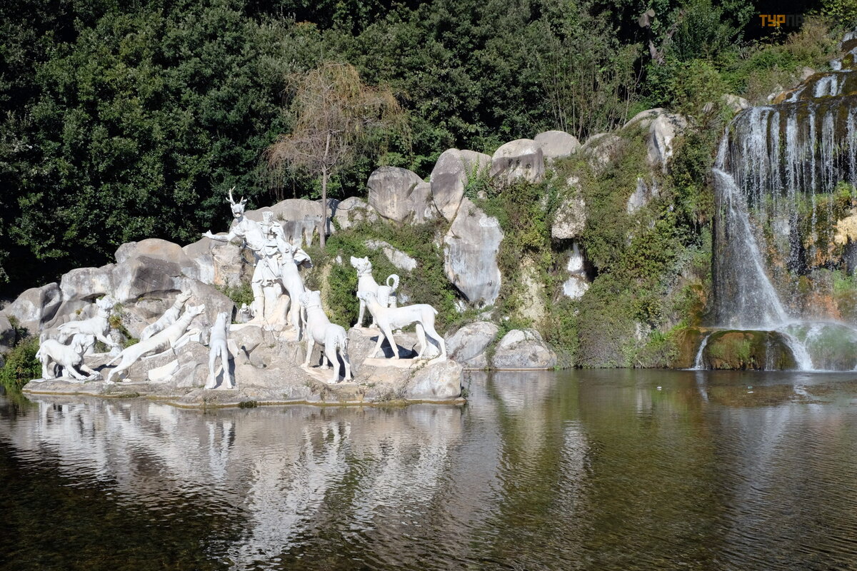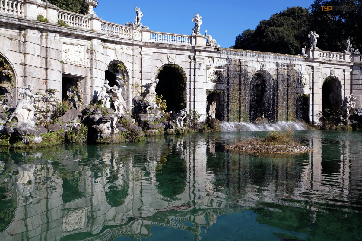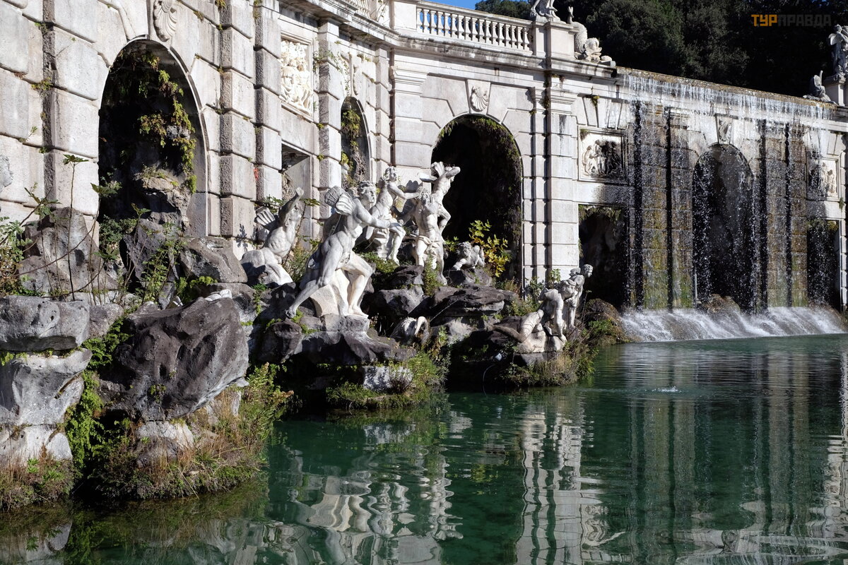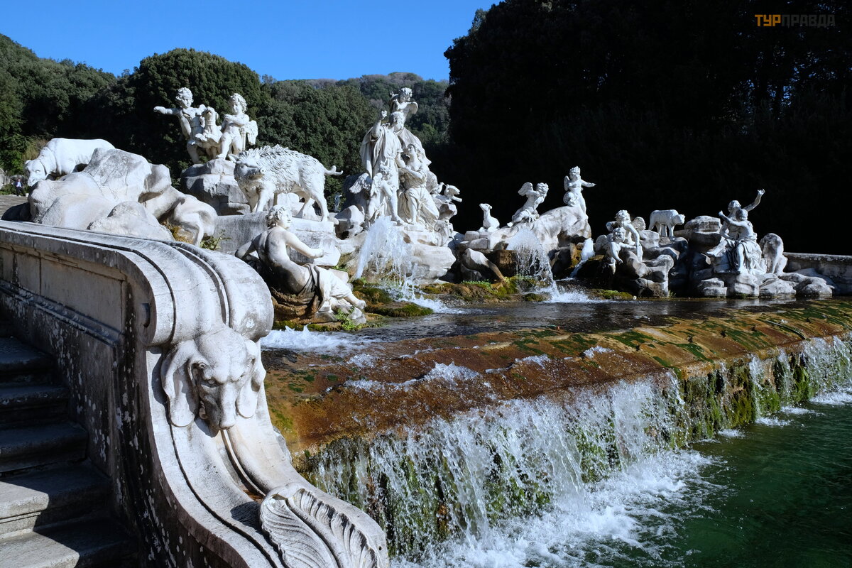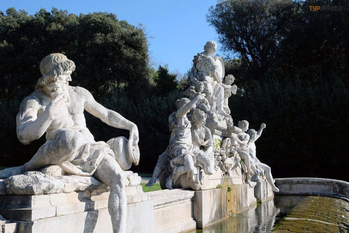 Artcard kasoje gavę bilietą , pirmiausia nuė jome apž iū rė ti parko su fontanais (jei tik yra jė gų ir nė ra taip karš ta). Siekdamas tiekti vandenį iš kalnų fontanams, Vanvitelli pastatė grandiozinį akveduką . Tie. vanduo teka nuo kalno link rū mų . Kelias nuo rū mų iki kalno yra 3 km ir į kalną .