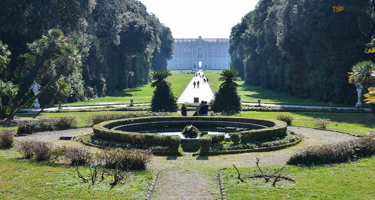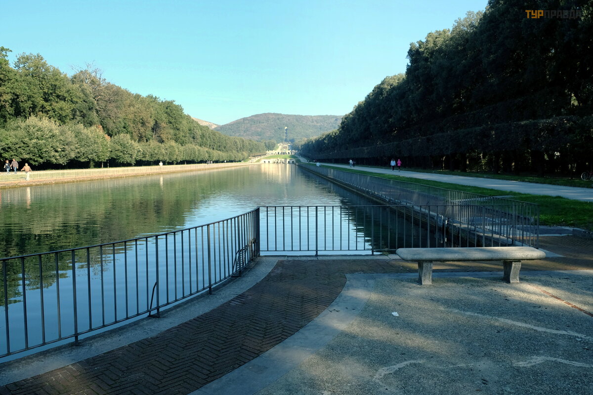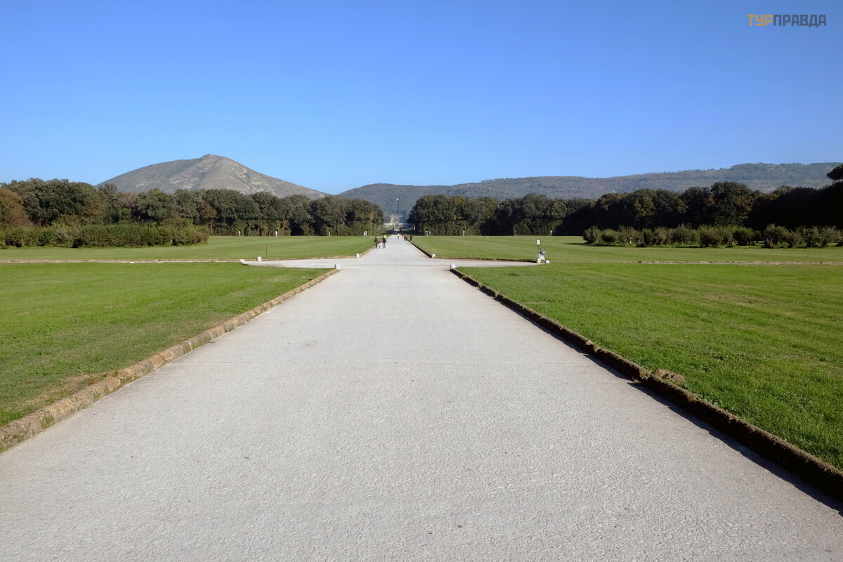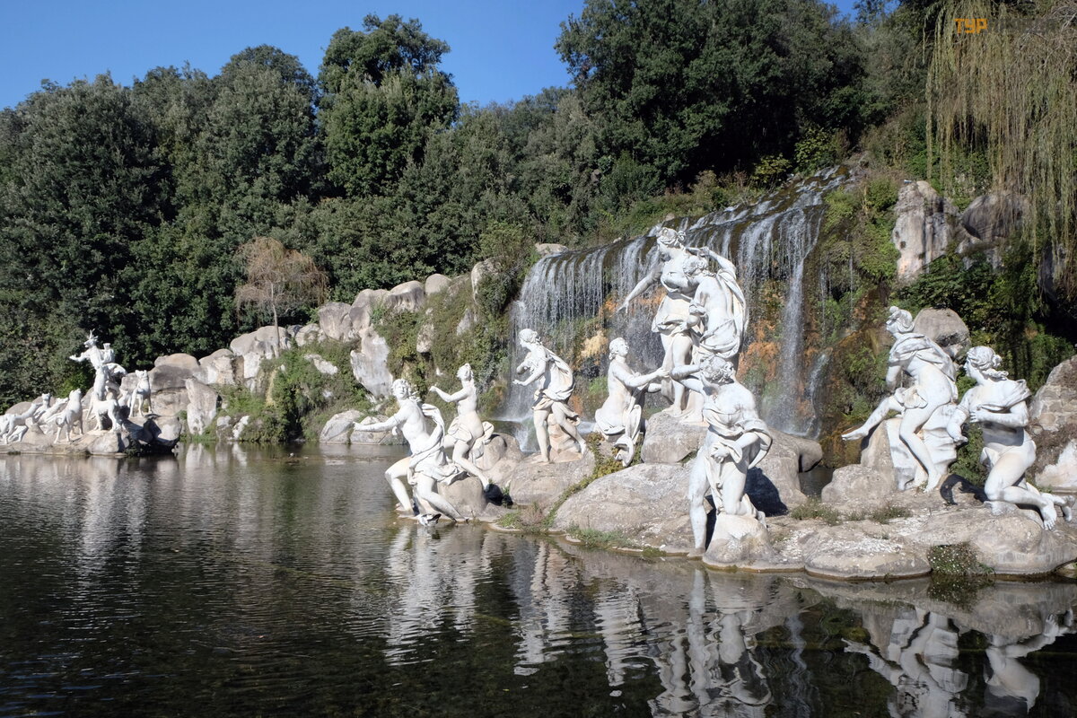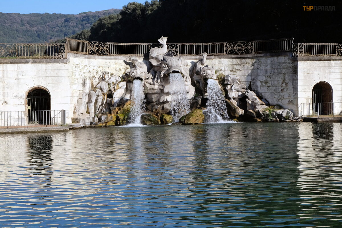 Artcard kasoje gavę bilietą , pirmiausia nuė jome apž iū rė ti parko su fontanais (jei tik yra jė gų ir nė ra taip karš ta). Siekdamas tiekti vandenį iš kalnų fontanams, Vanvitelli pastatė grandiozinį akveduką . Tie. vanduo teka nuo kalno link rū mų . Kelias nuo rū mų iki kalno yra 3 km ir į kalną .