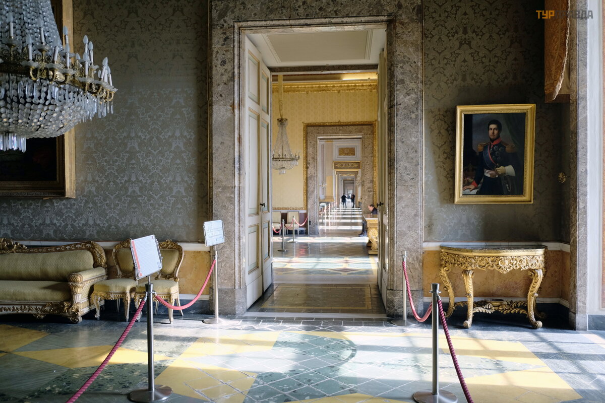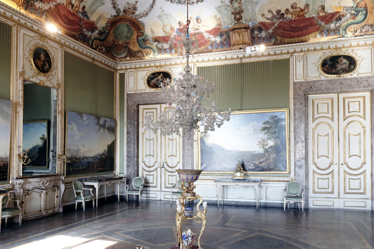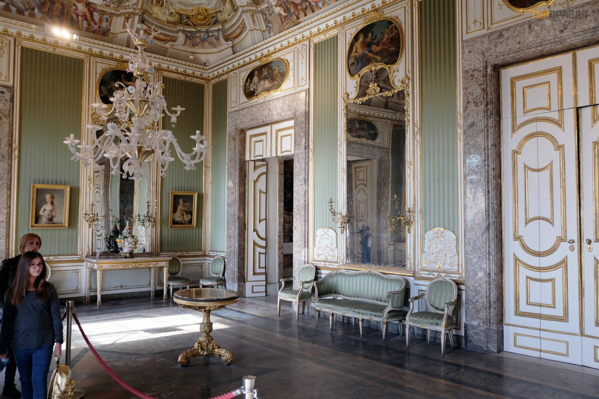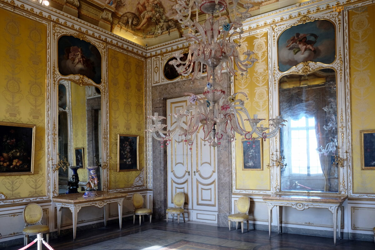 Toliau prasideda pompastiš kos ir gausiai dekoruotos iš kilmių salė s: Alebardų , Asmeninių sargybinių , Aleksandro, Marso, Astrea.