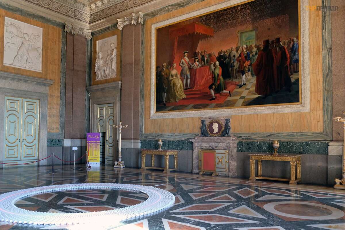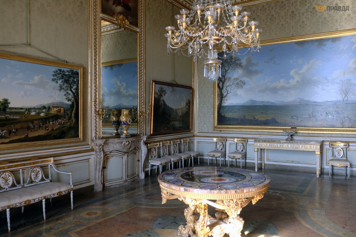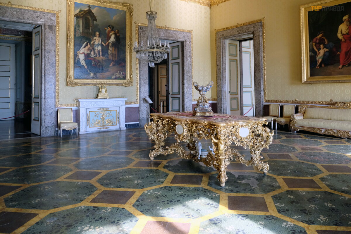 Parko ž emė lapyje buvo paž ymė tas antrasis iš ė jimas arč iau rū mų , tač iau jis buvo už darytas ir vė l teko apeiti parką prieš inga kryptimi. Saulė jau š vietė galingai, temperatū ra buvo +22, š eš ė lis paliko kelią ir teko grį ž ti atgal š eš ė liais takais. Trumpam sustoję ant parko suoliukų už ką sti, pradė jome apž iū rė ti rū mus. Rū mai didž iuliai – 1200 kambarių (daugiau nei Ž iemos rū muose Sankt Peterburge), iš kurių atidaryta deš imtadalis. Nusprendė me eiti kuo toliau, nes jau bangavo 9 kilometrus per parkus. Rū mai paliko gana malonų pojū tį : labai š viesū s ir aukš ti, pagrindinė kambarių spalva – balta su auksu. baroko stiliaus XVIII amž iaus salė s, ampyro stiliaus XIX a.