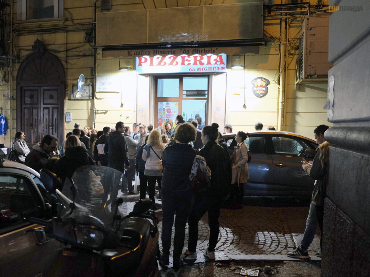 Vakare nuė jome į legendinę piceriją Da Michele (itališ kai Da Michele), netoli nuo centrinė s stoties. Š i seniausia š eimos picerija veikia nuo 1870 m. Populiarumo pridė jo Julia Roberts, kuri č ia valgė picą filme „Valgyk, melskis, mylė k“, be jos, č ia lankė si daugybė į ž ymybių su neapolietiš ku dievu Maradona prieš aky. Prie į ė jimo visada daug ž monių , staliukų rezervacijų nė ra.