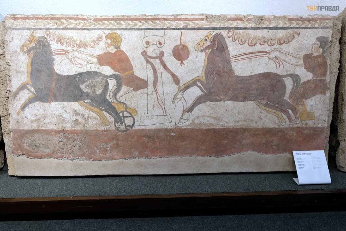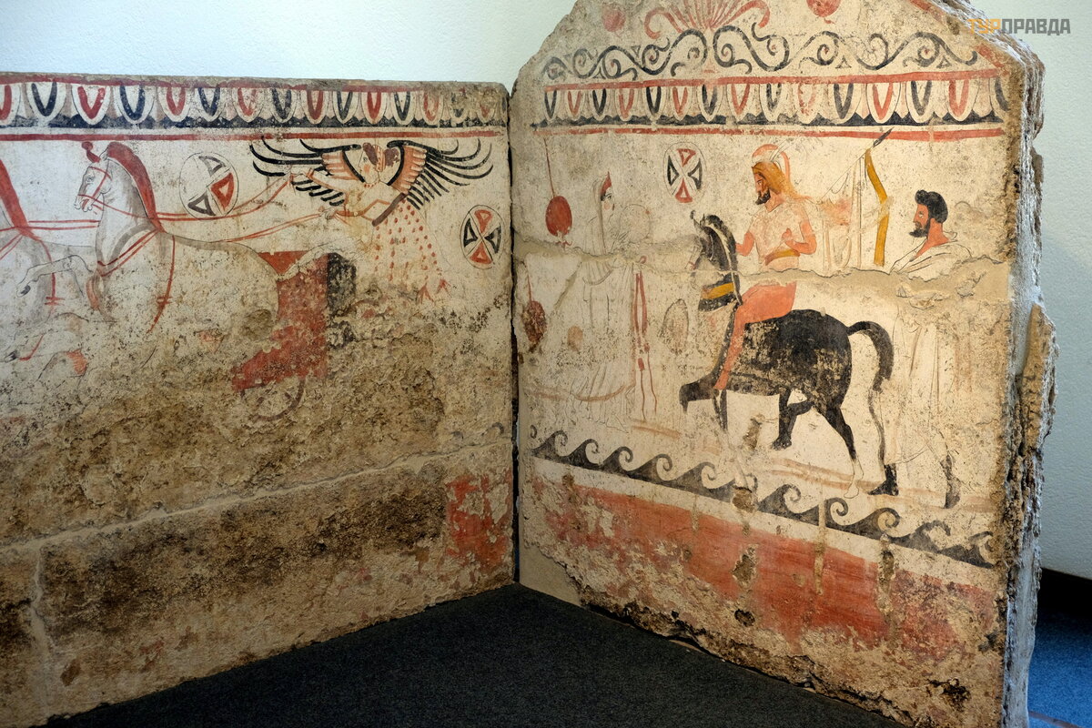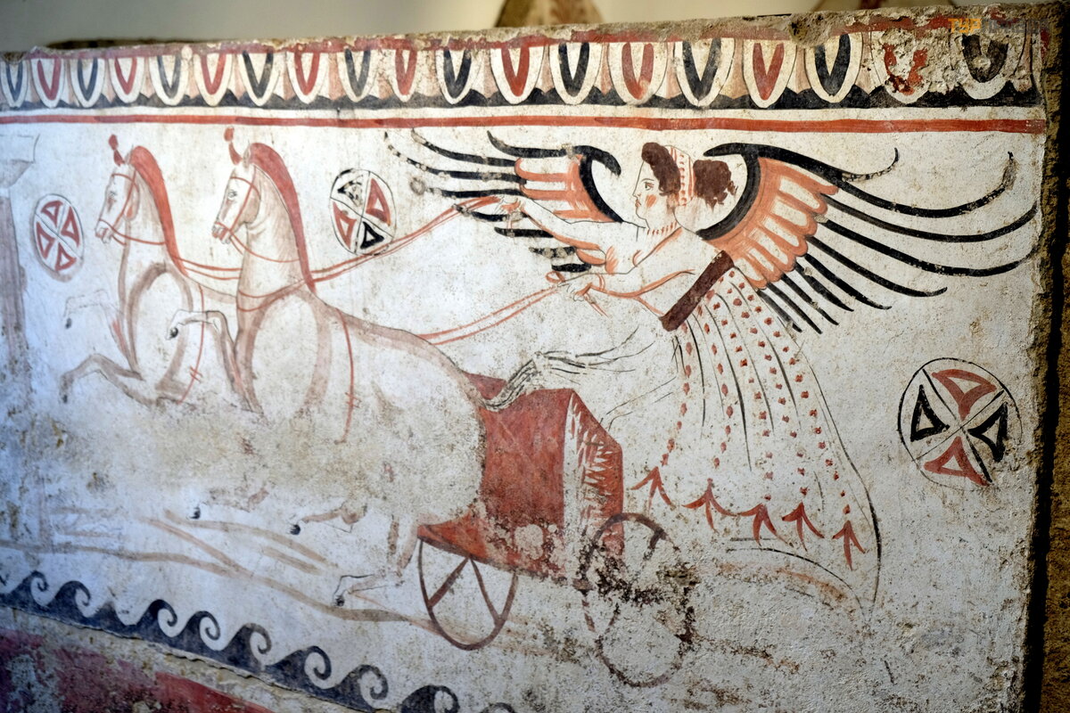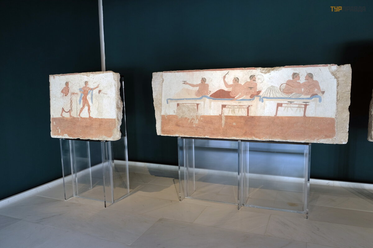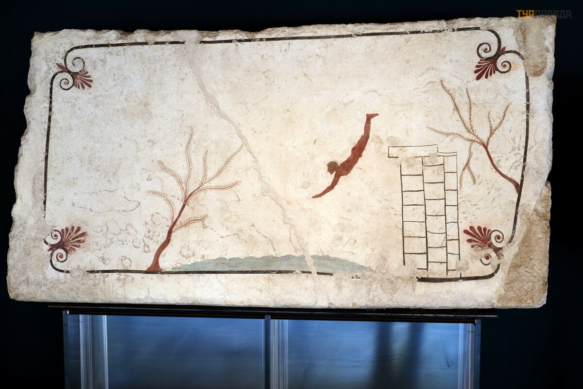 Ir š i naro freska (apie 470 m. pr. Kr. ), kuri yra skiriamasis komplekso pož ymis. Jis puikuojasi ant visų reklaminių broš iū rų ir plakatų . Freska buvo ant antkapio ir tai ne vandens procedū ros, o perė jimas į pomirtinį pasaulį .