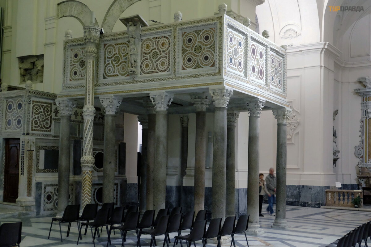 Tač iau kampanilė š imtmeč iu jaunesnė už katedrą , todė l jau arabų -normanų kilmė s, 56 metrų aukš č io.