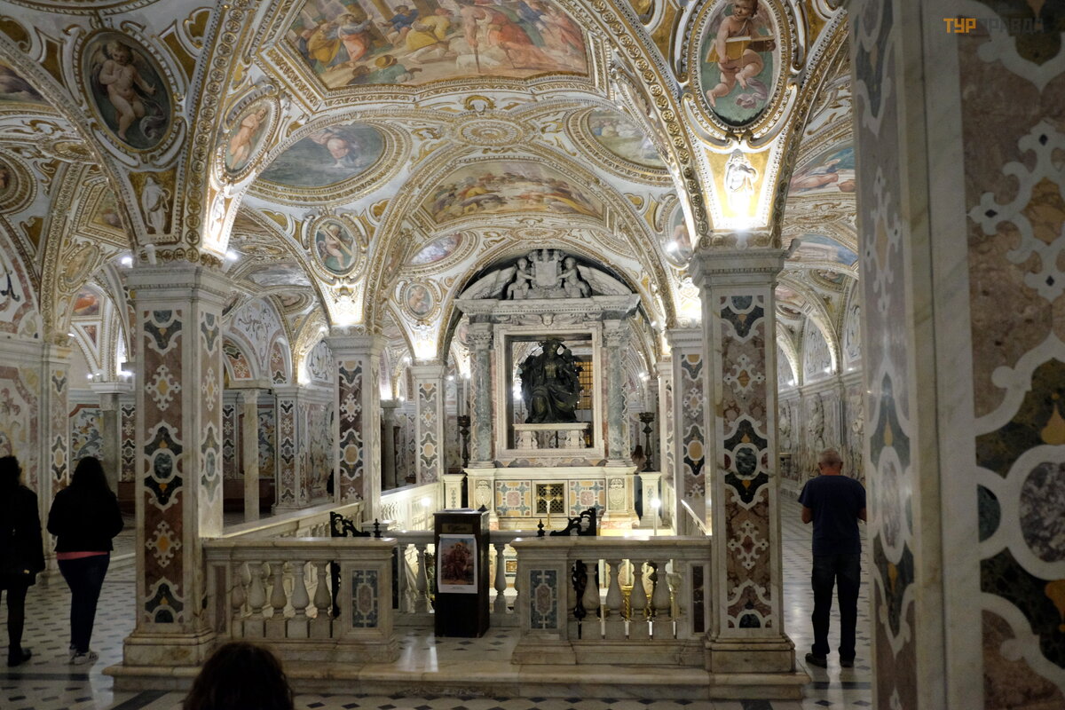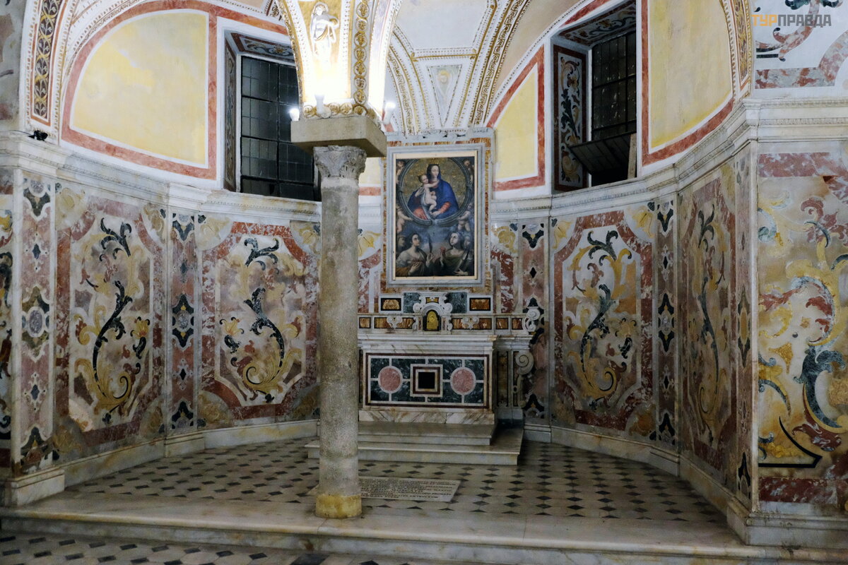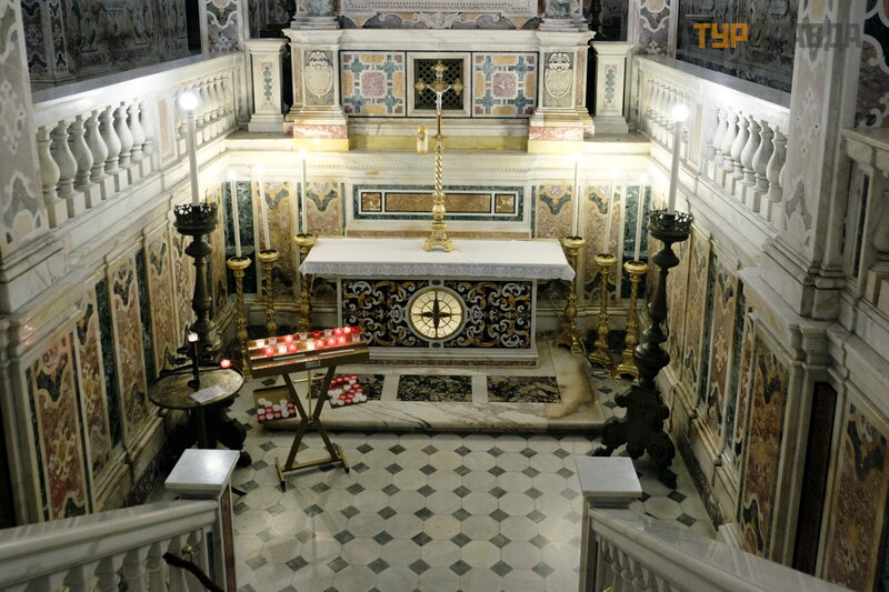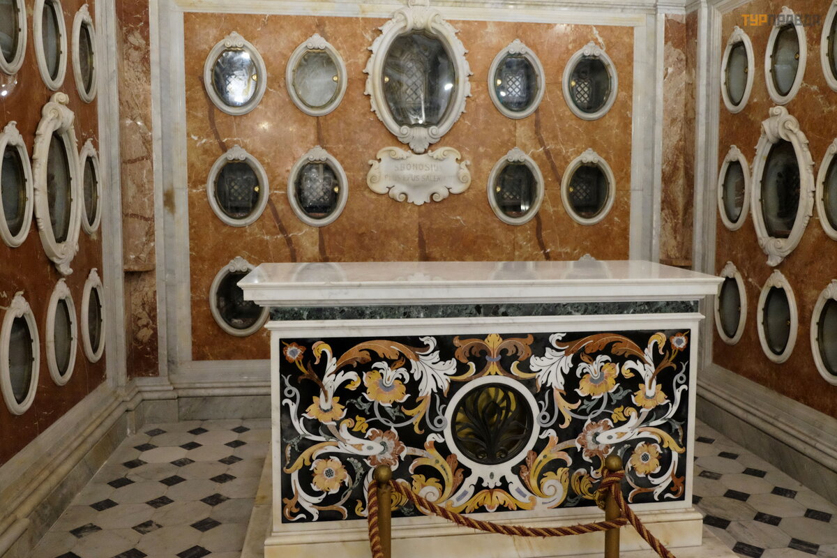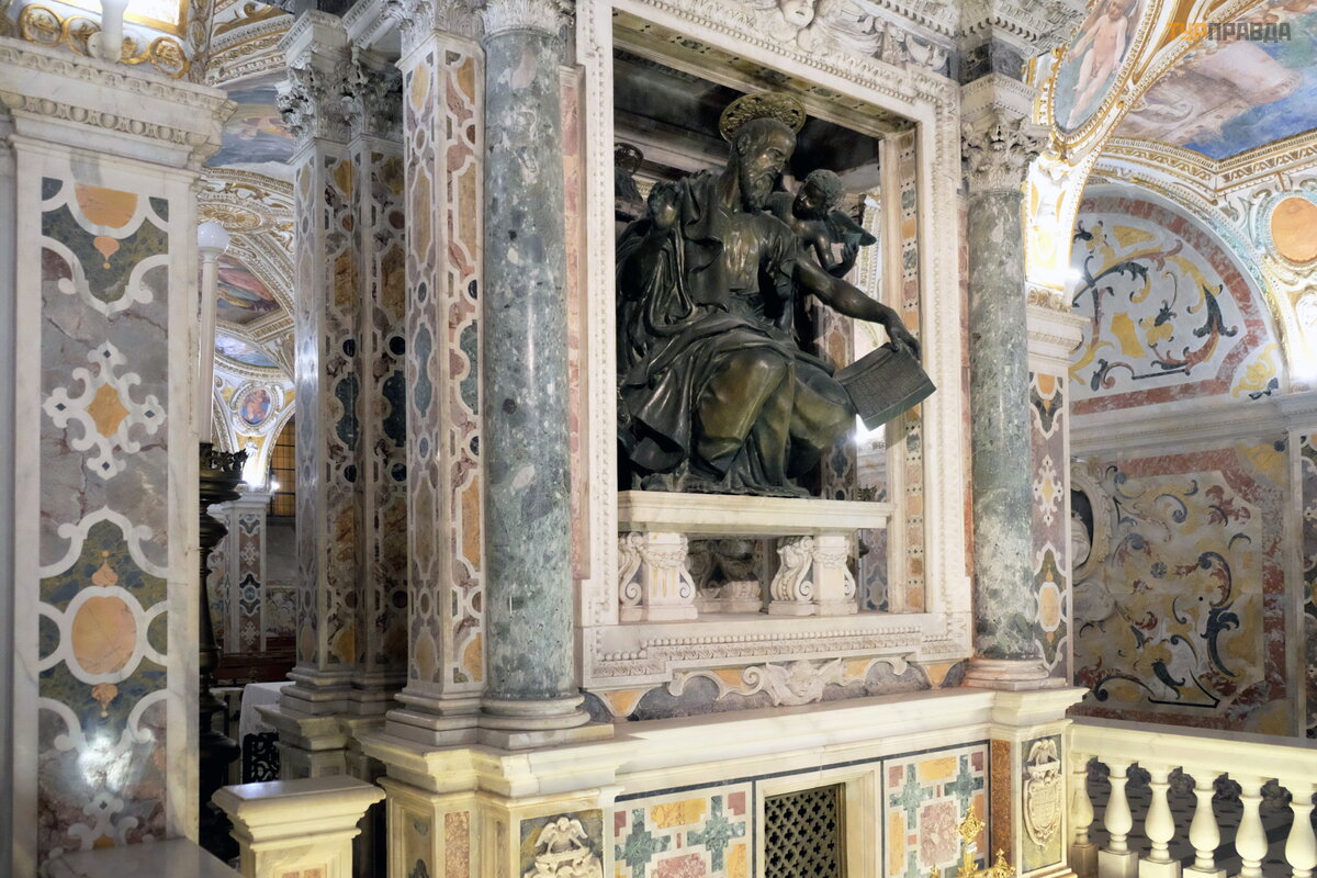 Kriptoje yra Š v. Apaš talo Mato kapas (į ė jimas 1 euras), kriptą XVII amž iuje atstatė architektai Dominico Fontana ir jo sū nus Giulio. Pats Š v. Mato kapas yra po altoriumi su to paties Fontanos pagamintu baldakimu. Michelangelo Noccherino skulptū ra.