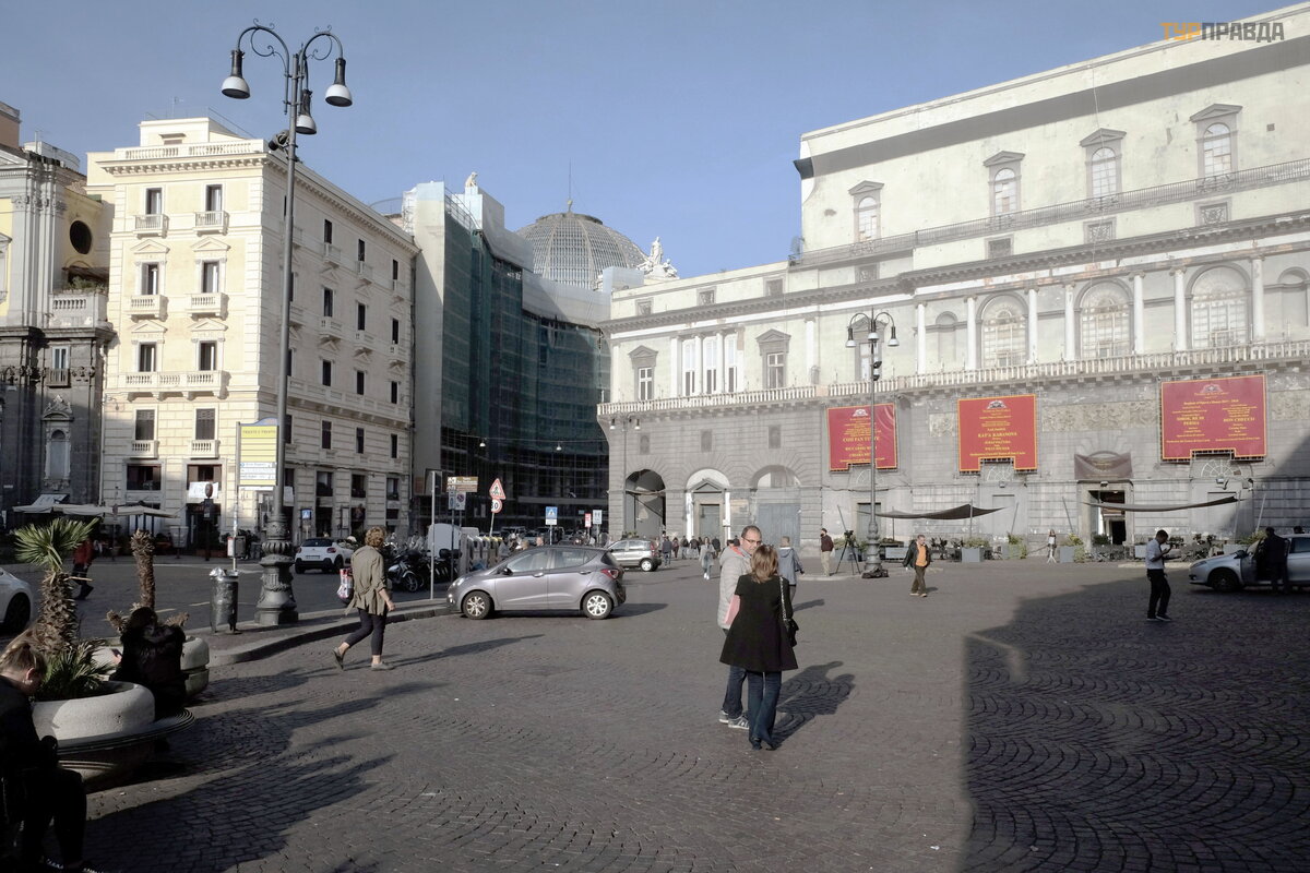 Š alia garsiosios San Karlo operos ir baleto. Pastatas (architektas Medrano) iš kilmingai atidarytas 1737 metų lapkrič io 4 dieną , karaliaus vardadienį , t. y. Karolio, kurio vardu teatras buvo pavadintas, š ventę . 1816 m. teatrą po gaisro vos per š eš is mė nesius atkū rė florentietis Nikolini, parengę s naują fasado projektą . Teatras ž avi prabangiu interjeru, o daugelis ekspertų akustiką laiko geriausia pasaulyje. Deja, dabar dalis fasado remontuojama.
