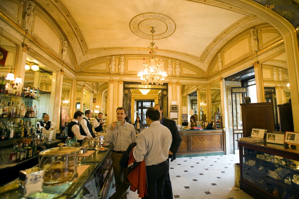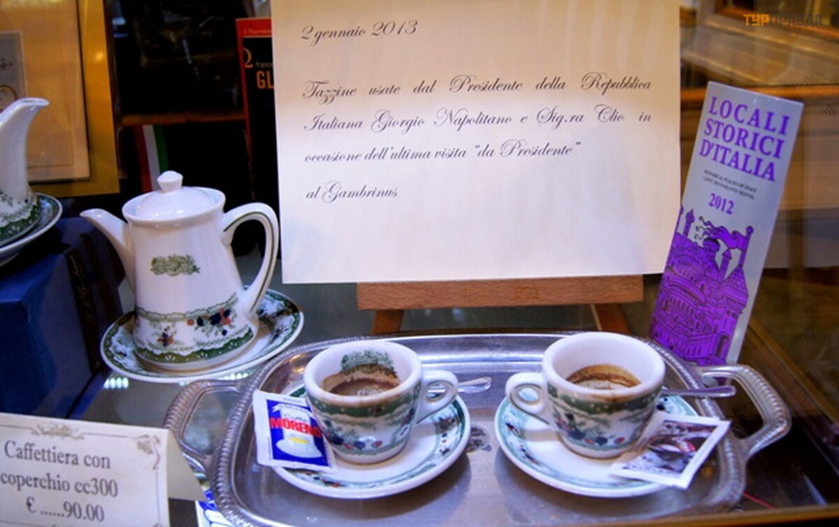 Kitoje aikš tė s pusė je yra garsioji kavinė „Gambrinus“, veikianti nuo 1860 m. Kas ten nebuvo: Stendhal ir Rossini, Oscar Wilde ir Hemingway, Modigliani ir Jean-Paul Sartre, princesė Sissi ir net popiež ius Jonas Paulius II, eidamas pro š alį , palaimino kavinę . O š ie neplauti puodeliai eksponuojami po apsilankymo pas Italijos prezidentą su ž mona.