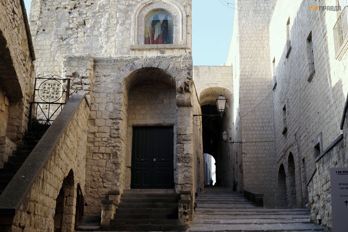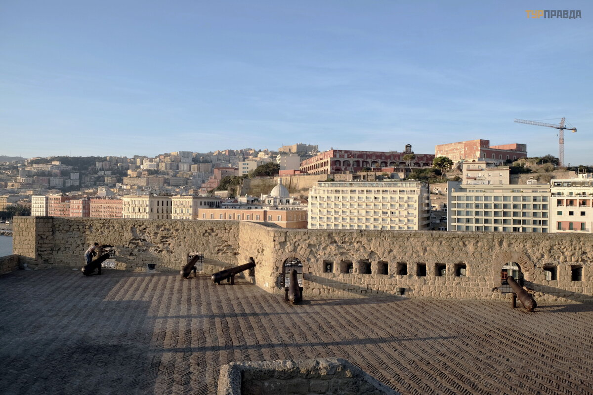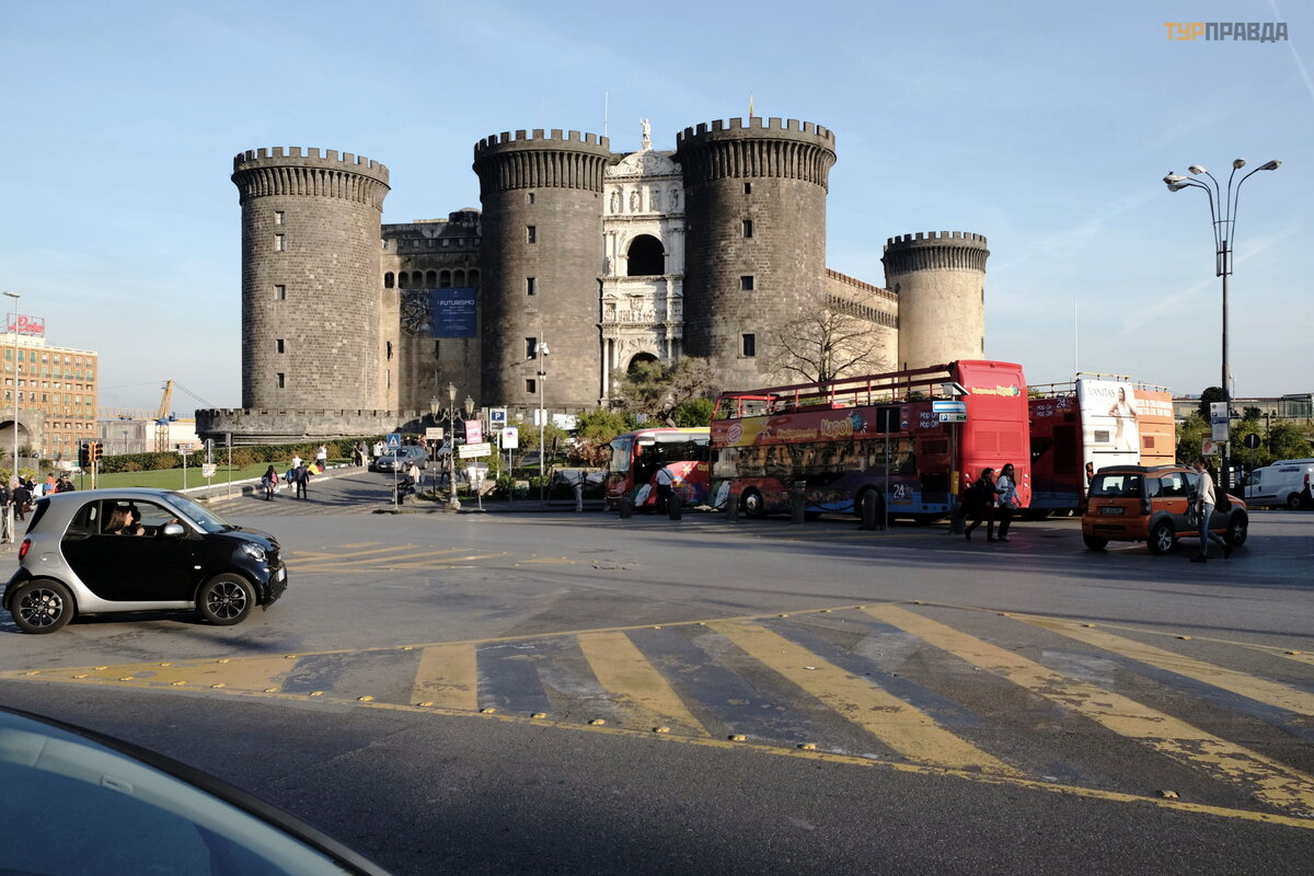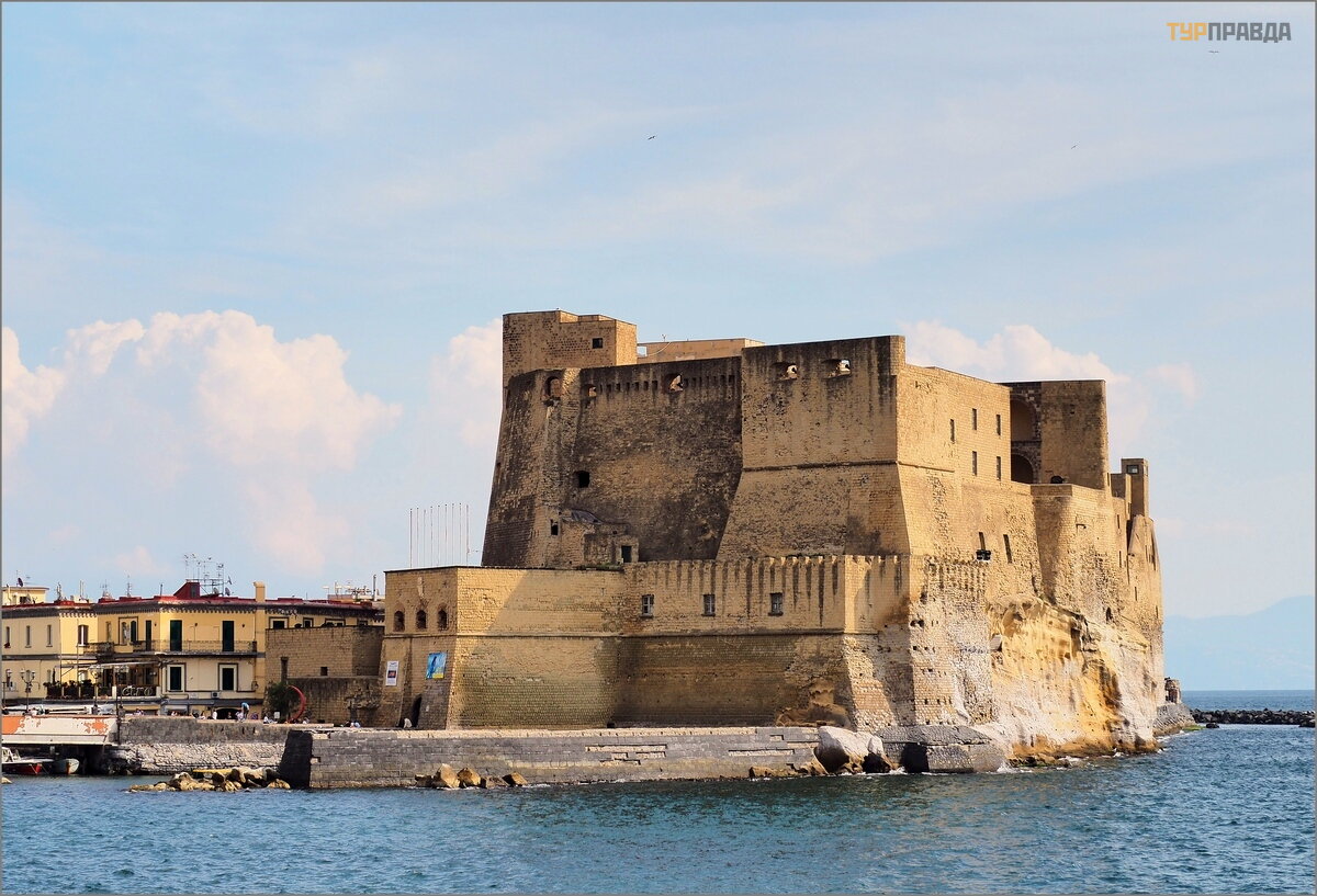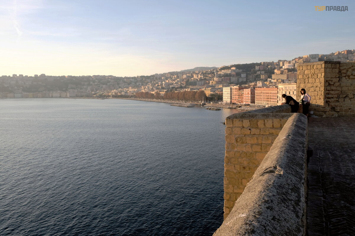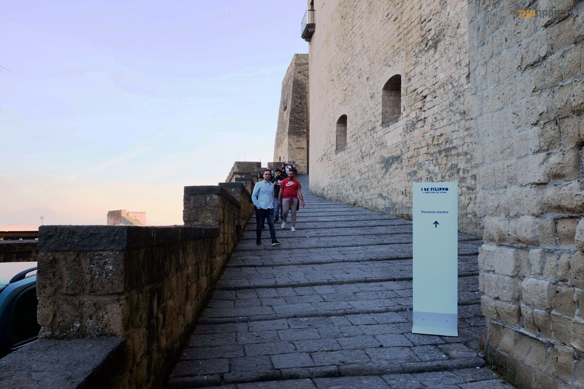 Tada nuė jome apž iū rė ti seniausio Neapolio pastato Castel dell'Ovo (Castel dell'Ovo) "Kiauš inio pilis". Yra legenda, kad Vergilijus č ia palaidojo stebuklingą kiauš inį , kuris saugojo miestas. Pilies istorija siekia Senovė s Romos laikus: č ia buvo Lucullus vila, garsė jusi gausiomis vaiš ė mis. Ankstyvaisiais viduramž iais č ia buvo vienuolinė dykuma. 1128 m. Varangijos princas Roger II saloje pastatė pilį .