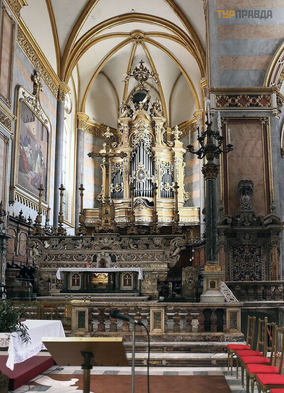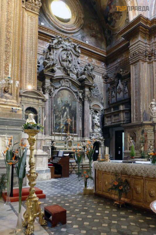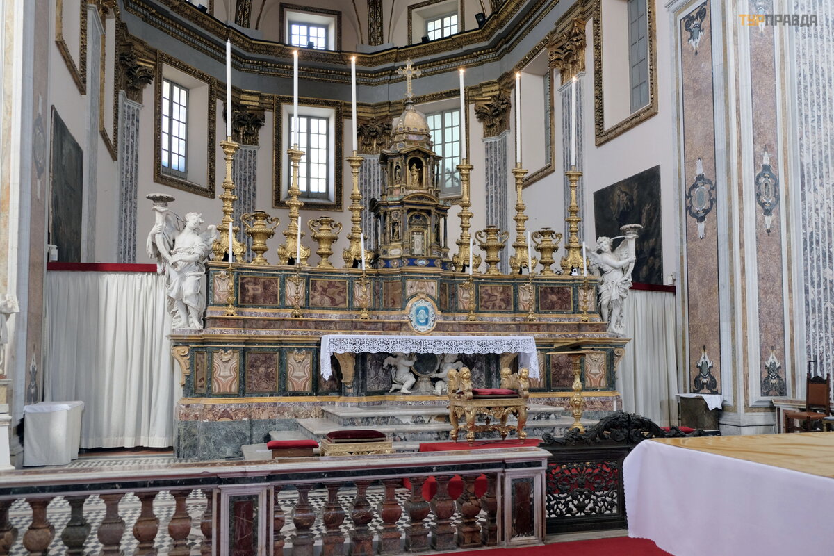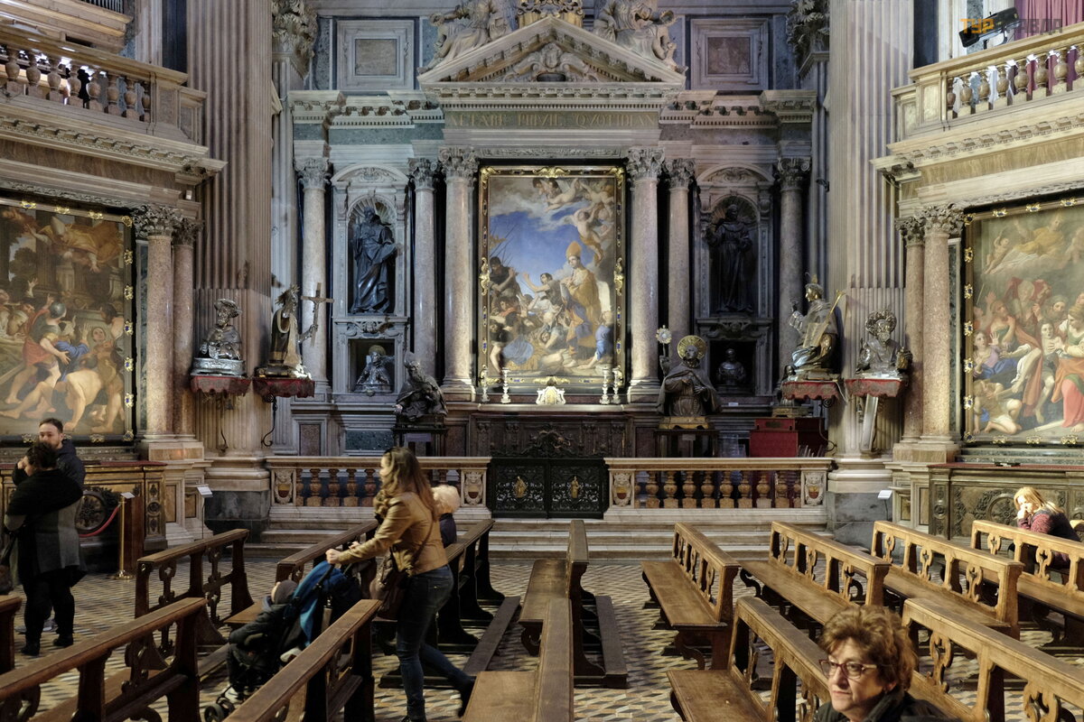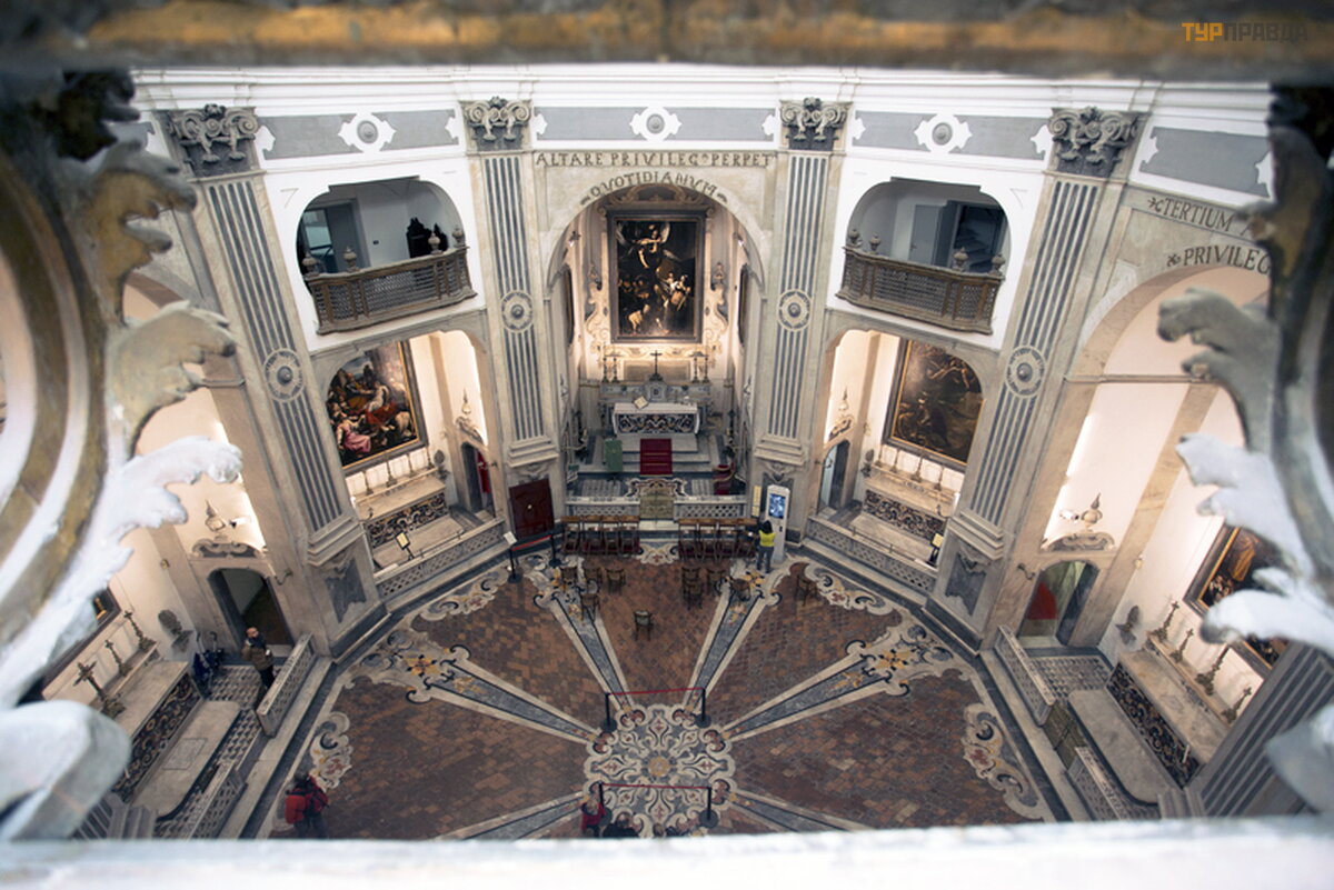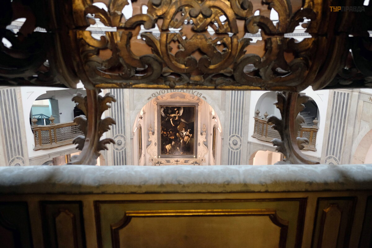 Pagrindinį baž nyč ios altorių puoš ia Carravaggio paveikslas, kurį galima pamatyti iš antrojo aukš to galerijos.