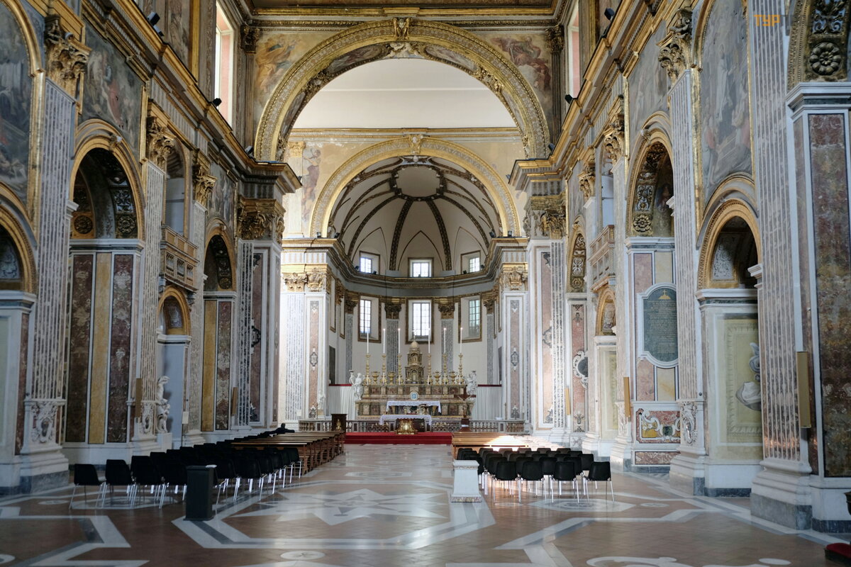 Prieš baž nyč ią yra š oninis Duomo (Š v. Januario) katedros fasadas.