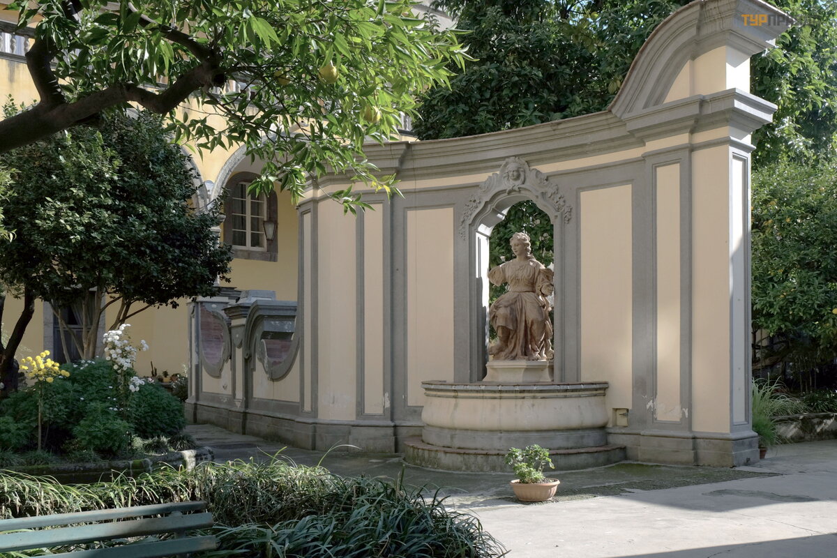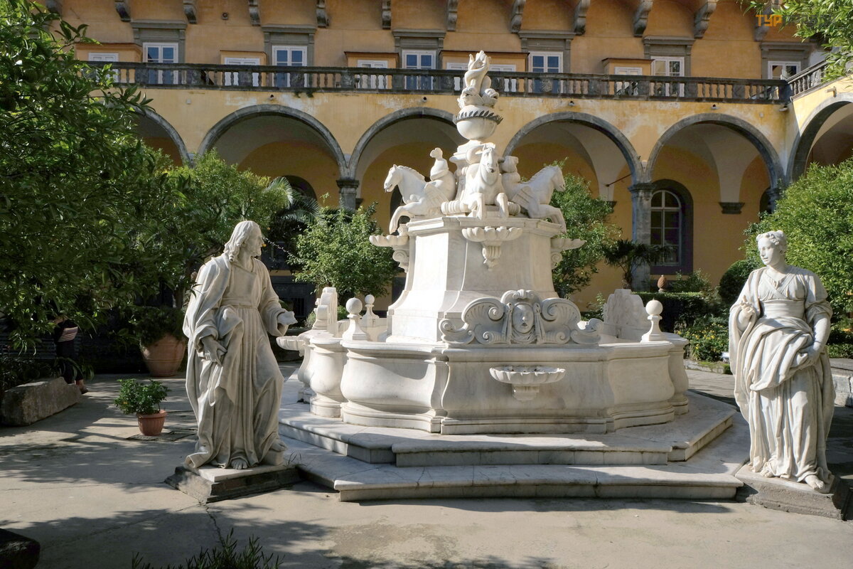 Į einame į vienuolyno kiemą , tikrą oazę kitų pastatų fone istoriniame Neapolio centre, kur visi pastatai stovi arti vienas kito ir tikrai nesimato nė vieno fasado. Puikus sodas, apsodintas vaismedž iais (apelsinais, citrinomis) ir gė lė mis.