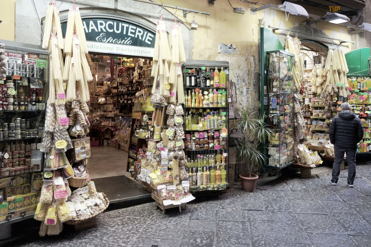 Š ioje Spaccanapoli dalyje gatvė je pilna į vairių parduotuvių , kavinių , konditerijos parduotuvių .
