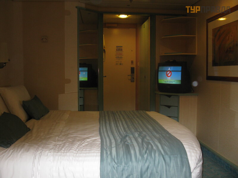 Kajutė - penkiolika metrų , didž iulė lova, dvi maž os sofos prie lango, stalas, veidrodis su tualetiniu stalu, kampinė spintelė su televizoriumi, į montuota spinta, prieš ais yra vonios kambarys su praustuvas, duš as ir tualetas. Viskas labai gerai apgalvota, funkcionaliai patogu ir jauku. Paveikslai ir š viestuvai ant sienų , ž inoma, vidinis telefonas, kondicionierius.