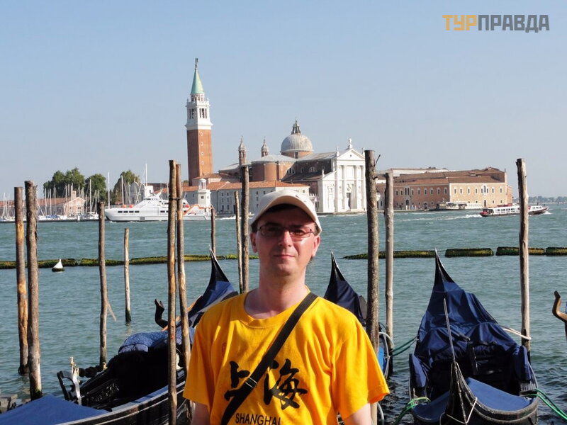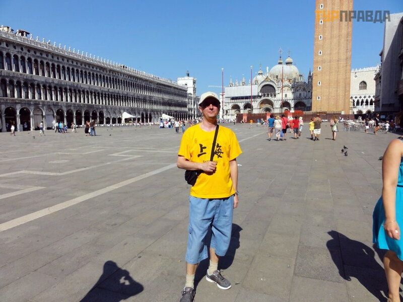 12:00 Š v. Morkaus aikš tė je, sausakimš oje turistų iš viso pasaulio, mums buvo į teiktos ausinė s ir prasidė jo pusantros valandos trukmė s kelionė pė sč iomis. Gidė italė Nada su neblogu rusu iš karto pasakė , kad „temperatū ra š iandien +38 ir jū s visi mirsite, nes karš ta, o jū s neturite panamos“ (aš asmeniš kai neš iojau kepurę , vadinasi, turė jo galimybę iš gyventi). Ekskursija praė jo siauromis miesto gatvelė mis, tarp senų namų , palei kanalus su gondolomis, siaurais tilteliais, praė jo Rialto tiltu.