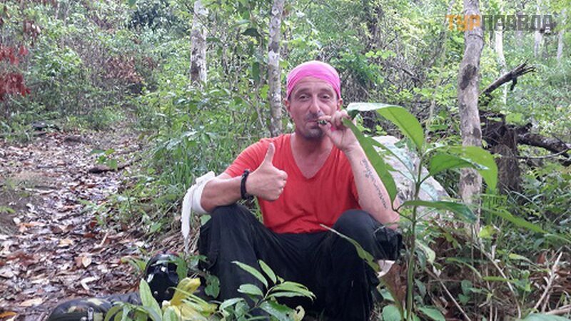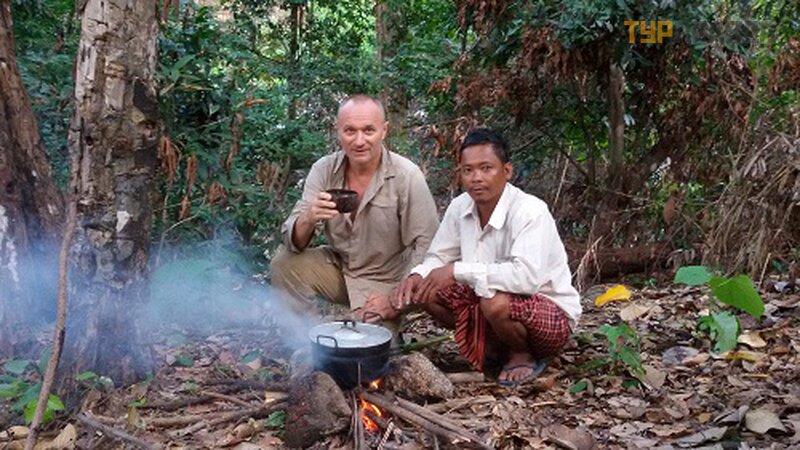 Mano rankose yra mano mė gstamiausias ž ygio puodelis - kokoso skeveldra su ž olelių arbata ir lapais, iš traukta č ia pat, aplink stovyklą . Netoliese yra gidas „Ponas Roma“, nuostabus vietinė s floros ir faunos ž inovas. Linksmasis bič iulis ir juokdarys.
