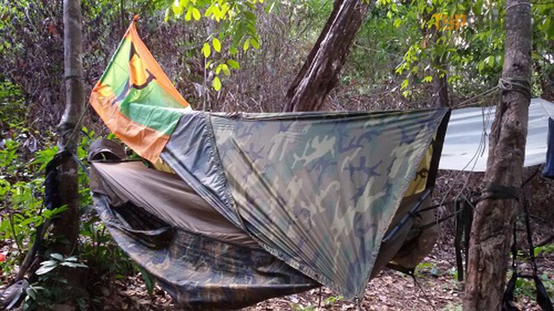 Nakvynė . Už manę s yra klasikinė bivuako organizavimo versija su hamaku ir į prastu armijos ponč u kaip tentu.