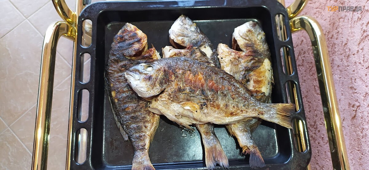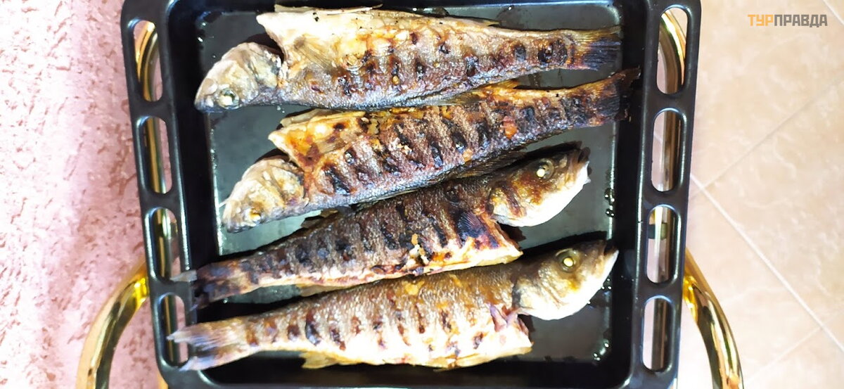 К 18-00 мы приехали домой и стали готовить праздничный стол. Вскоре была готова наша рыба на гриле от хозяина дома, а хозяйка сделала мне праздничный тортик.