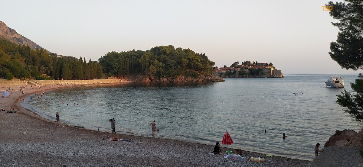 После сытного обеда мы посидели в парке на территории отеля, а потом пошли на их пляж. При входе на пляж в палатке купили ребенку коралки за 10 евро, которые развалились на второй день; до этого в Египте мы покупали по 3 доллара, и они были шикарные. Я в отзывах туристов читал, что этот пляж считается одним из худших в Будве и её окрестностях, я думаю это действительно так и есть. Много мусора в воде, нет туалетов и кабинок для переодевания, много мусора вокруг. Побыв там до вечера, прошлись по набережной в сторону старого города, попробовали устриц в конце набережной у причала рыбаков, а после выдвинулись в сторону дома. Но так как домой еще было рано, то на обратном пути мы заехали на Свети Стефан. Запарковали машину на платной парковке (42.25594839917093, 18.89503163206518) за 2 евро в час и пошли на пляж, который еще недавно стоил 100 евро в день, а теперь стал бесплатный. Правительство Черногории расторгло договор аренды с прошлым арендатором и на тот момент этот пляж, а также несколько других были абсолютно бесплатны.