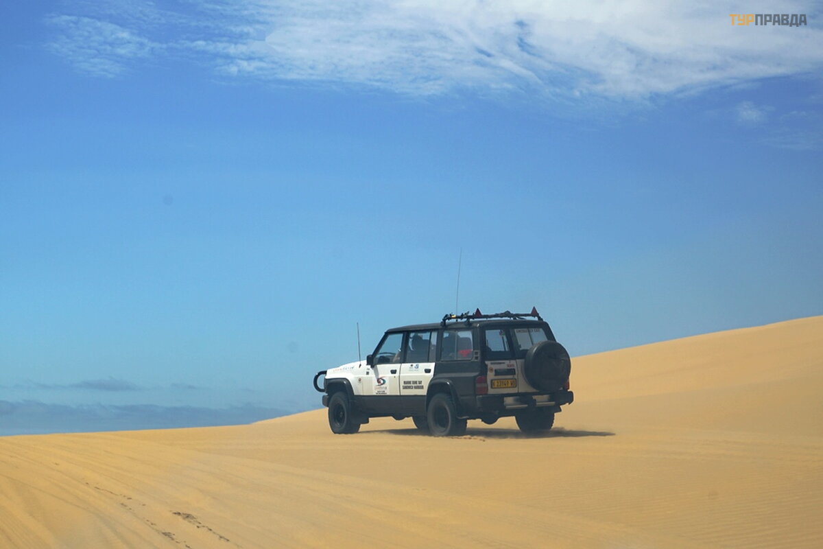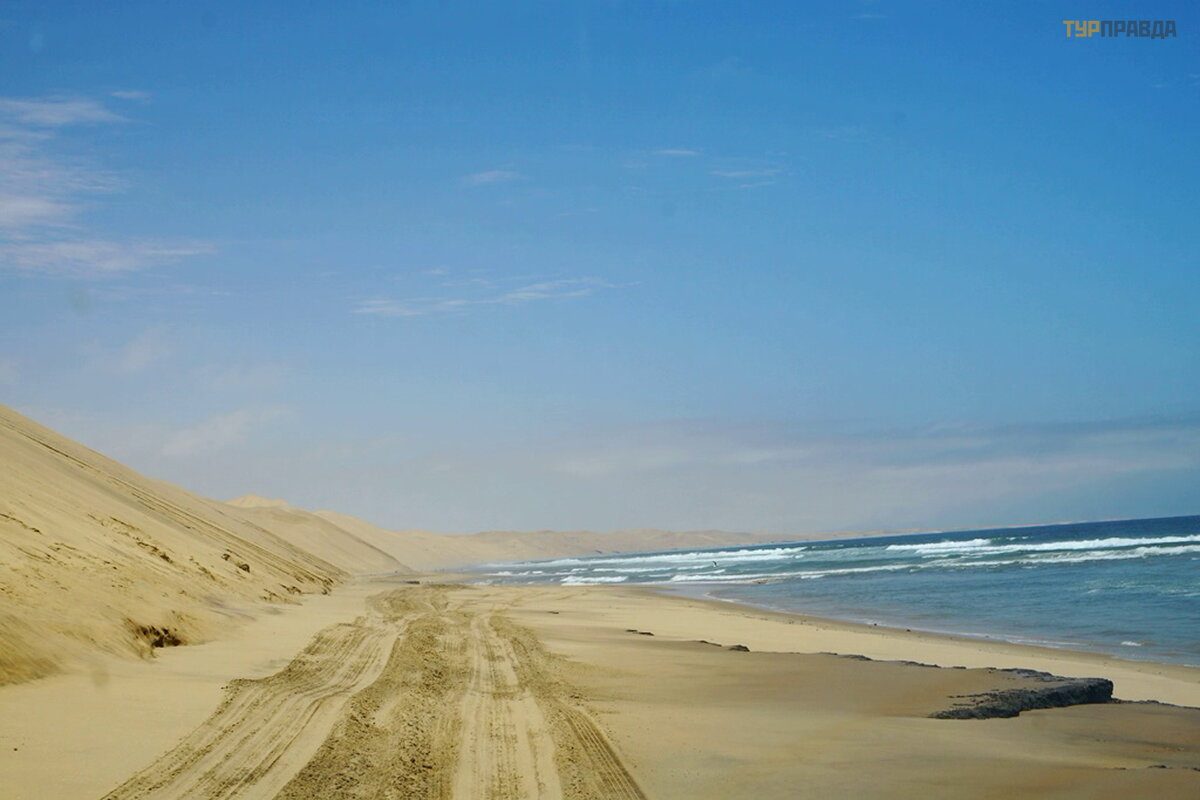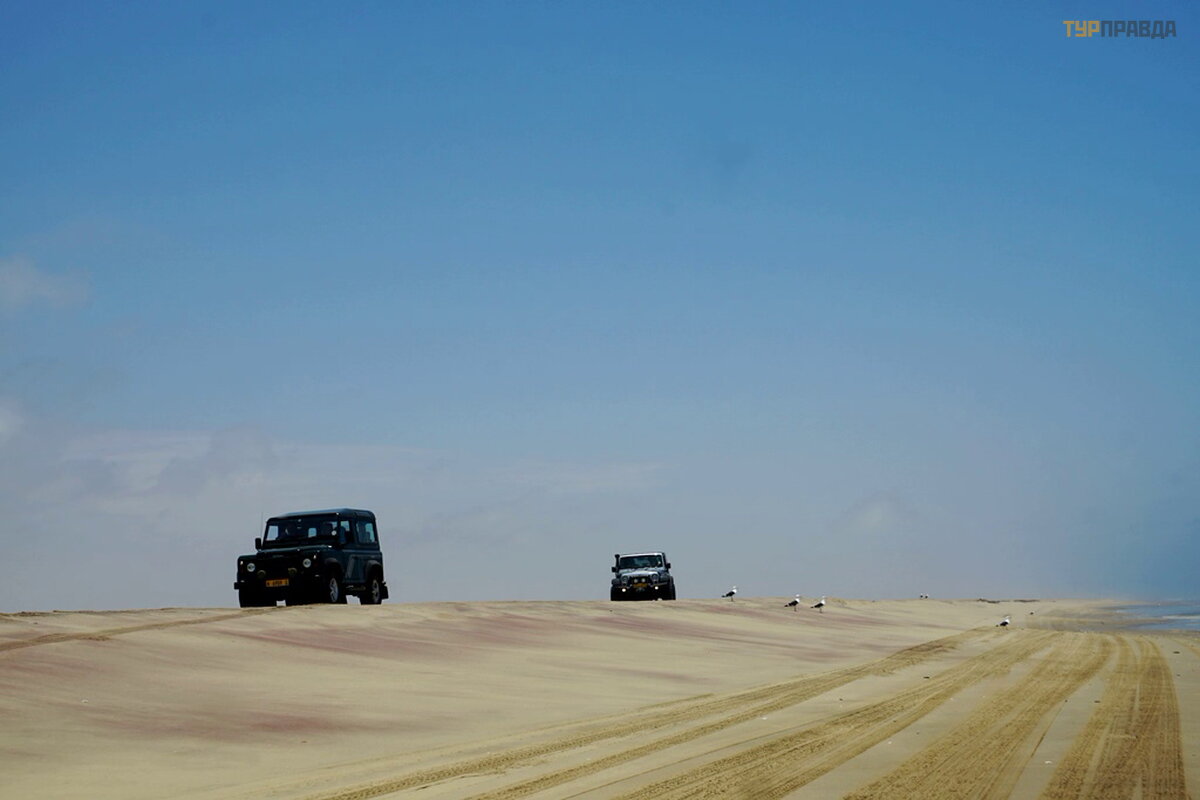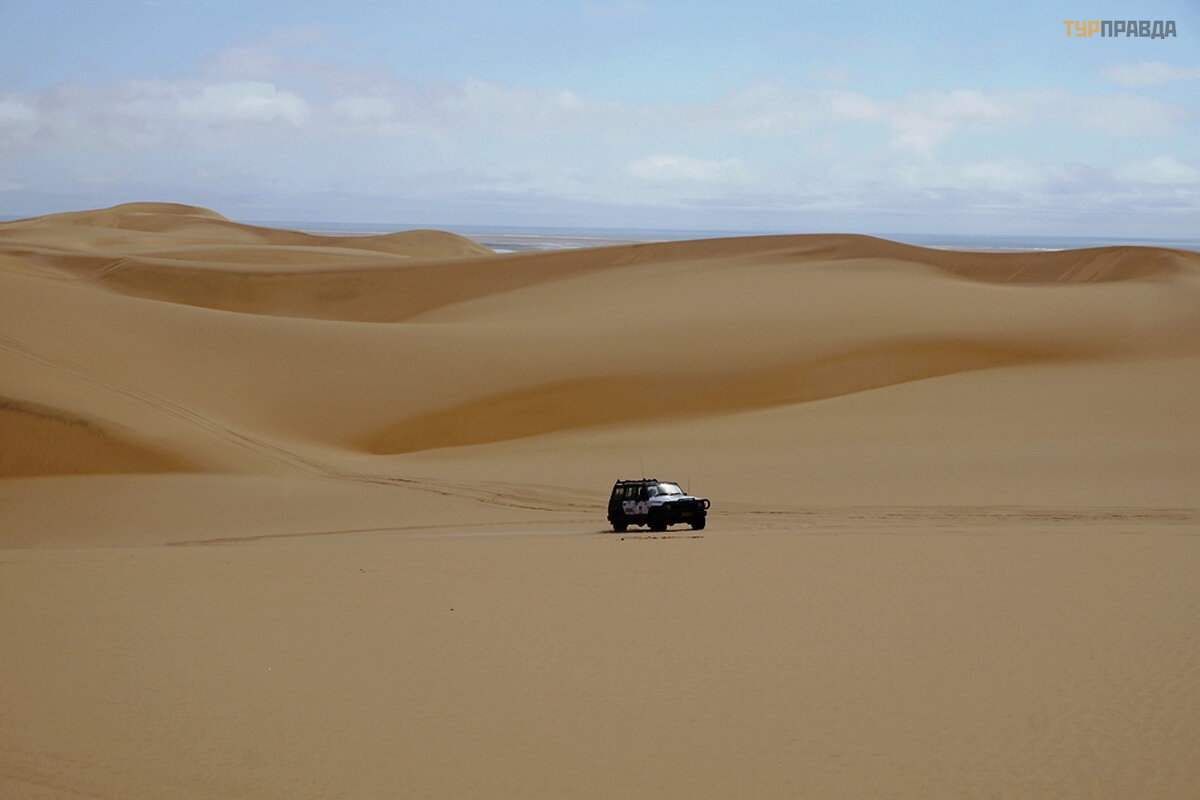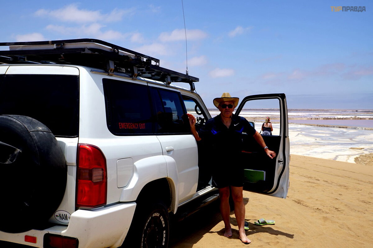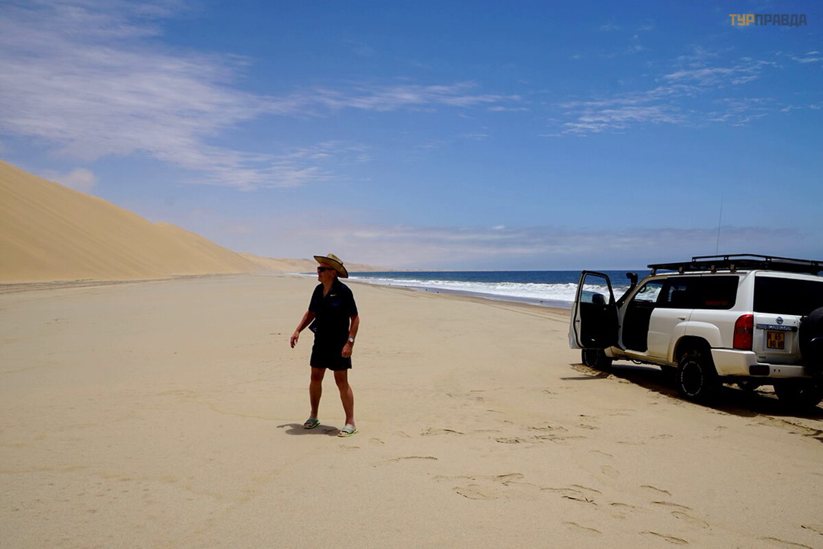 Po kelionė s jū ra per Atlantą mano kelionė tę sė si dž ipu į pietus nuo Namibijos 100 kilometrų . Važ iavome daugiau nei valandą tiesiai palei Atlantą smė lė tu krantu. Nuostabus automobilis Nissan. Pakeliui sustojome penkių minuč ių apž valgai. Kelyje buvo vieniš os katė s. Kai jiems buvo praneš ta, jie atsakė nepatenkinti. Buvome suporuoti su kitu „Nissan“. Vairuotojai nuolat palaikydavo ryš į radijo ryš iu, juokaudavo vienas su kitu. Namibijos smė lio peizaž ai – nepaprasti. Penkias valandas keliavome per Namibijos smė lį ir kopas. Nusileidimai nuo kopų buvo labai baisū s. Automobilis tapo beveik vertikalus, o paskui trū ktelė jo ž emyn ir aukš tyn. Po trijų valandų sustojome pietauti š ampano. Naujieji metai tę sė si. Vė l teko iš gerti pusantro butelio š ampano, kurio skonis geras. Tarp merginų buvau vienas, tad š ampaną teko gerti visiems vienam. Kai temperatū ra aukš tesnė nei + 40 laipsnių , š altas š ampanas ir net skanus geriamas lengvai ir daug. Už kandž iai buvo gausū s, skanū s ir į vairū s. Š is piknikas buvo skirtas paskutiniam sustojimui palei Atlanto vandenyno pakrantę . Tada mū sų kelias ė jo atgal per Namibijos smė lio kopas.
