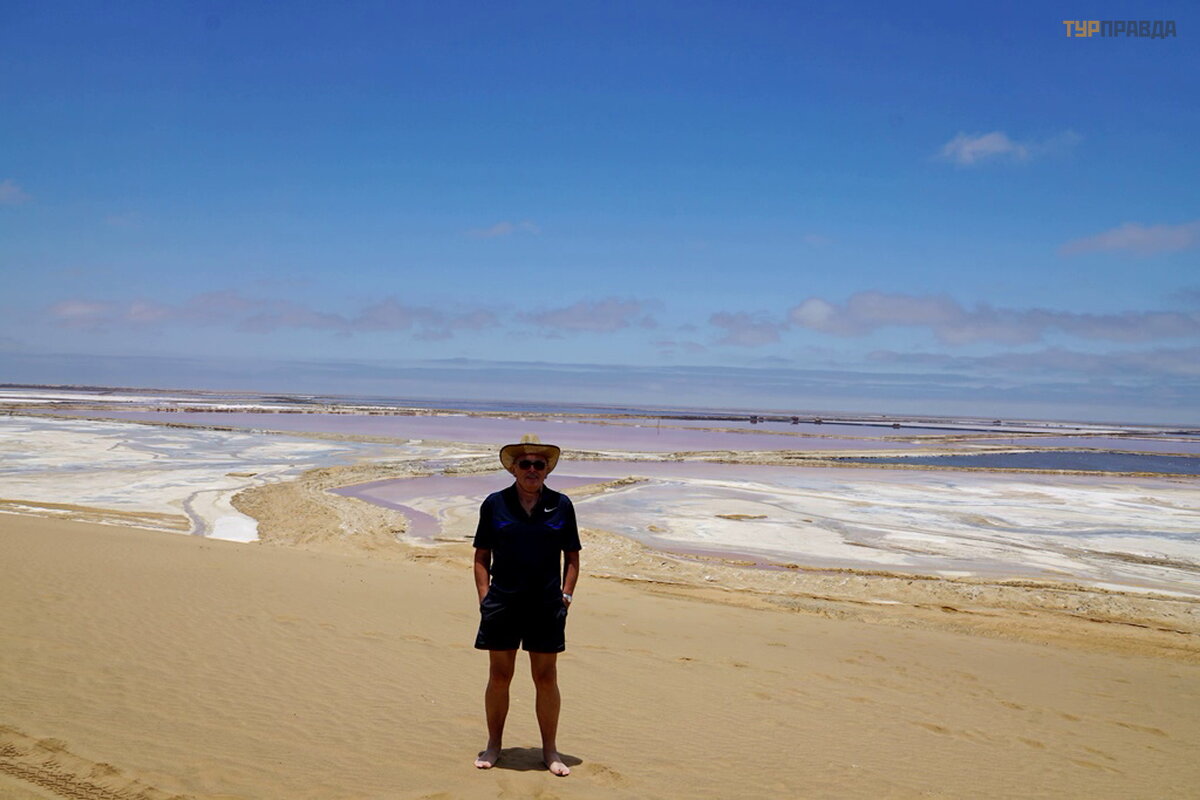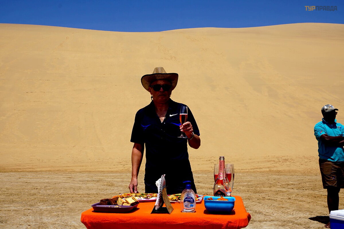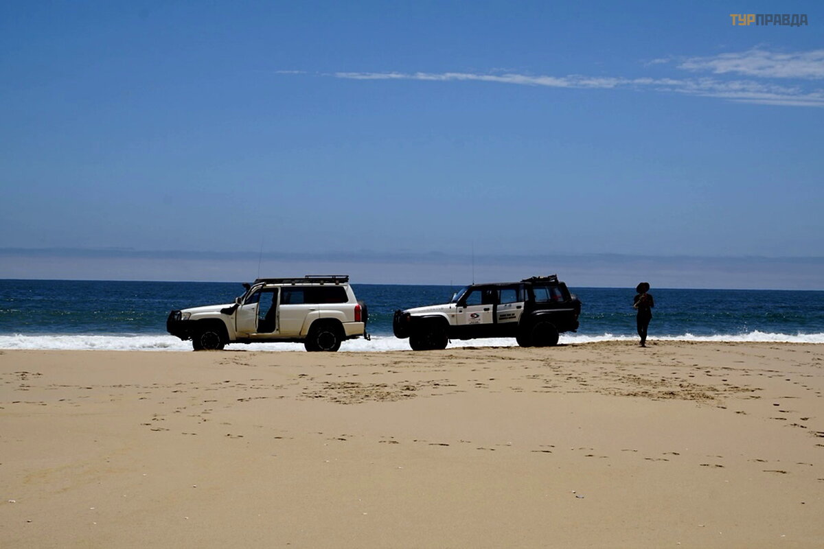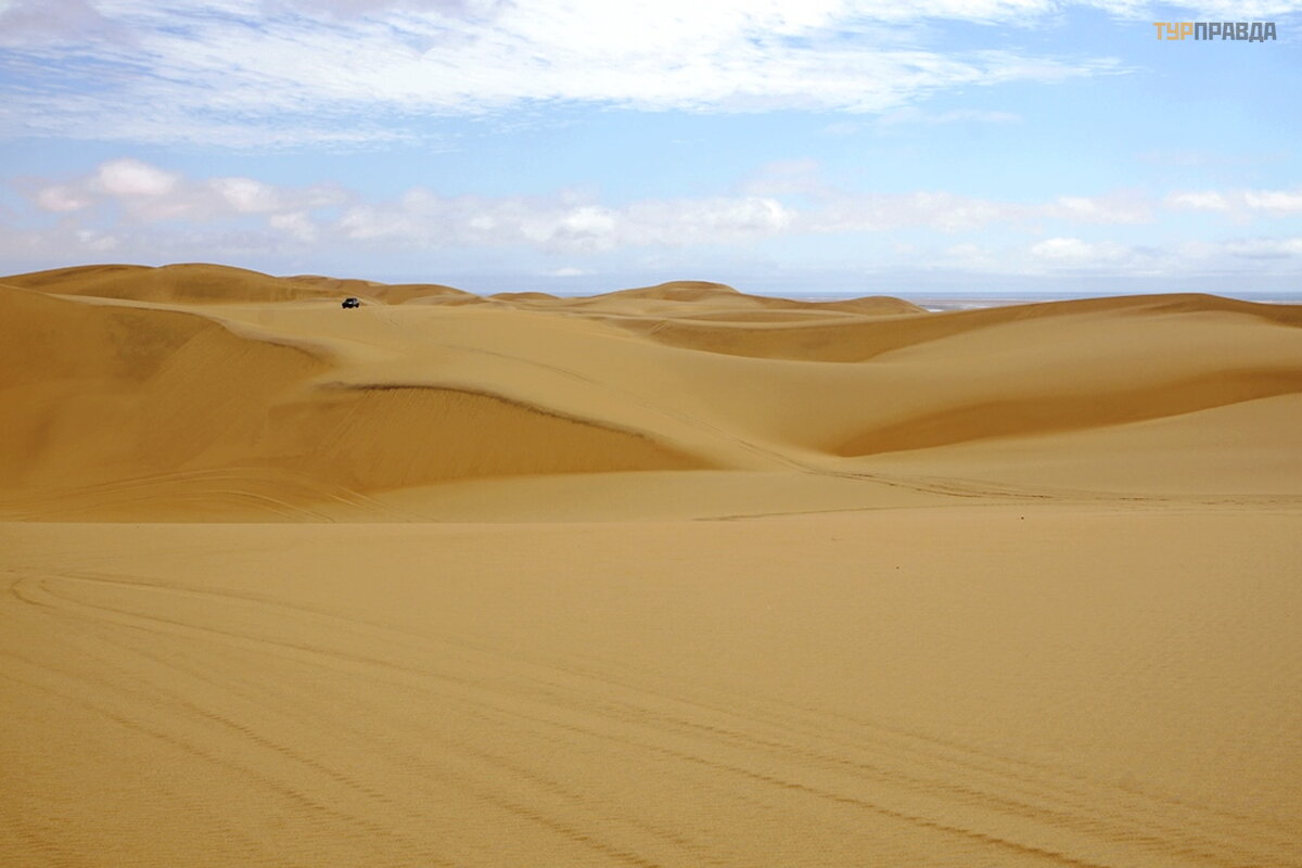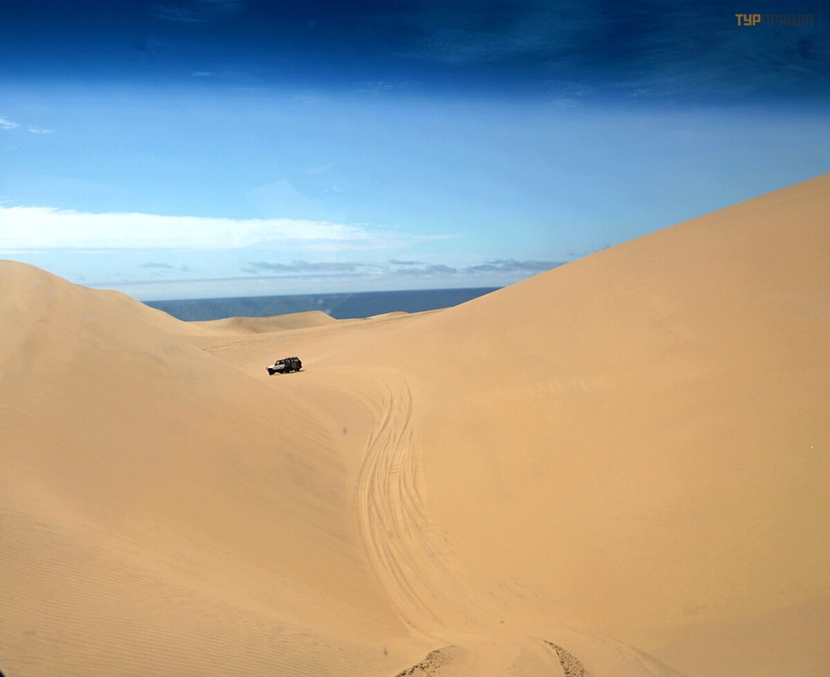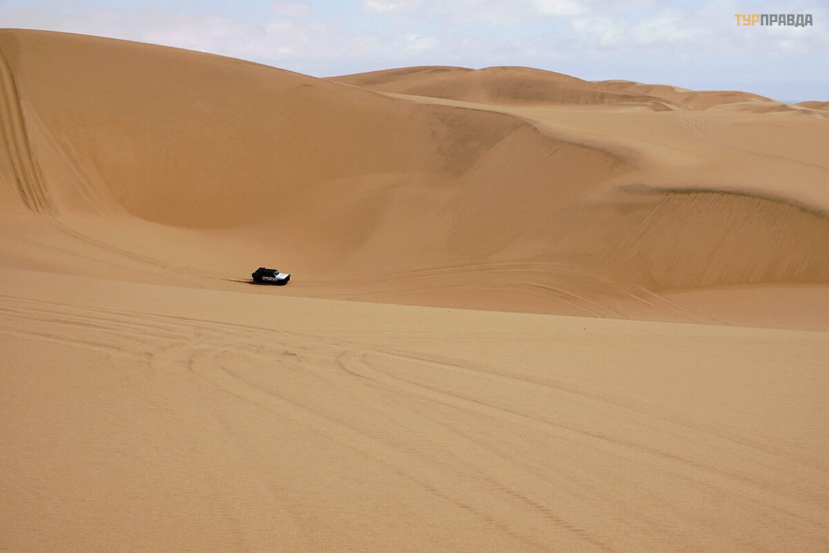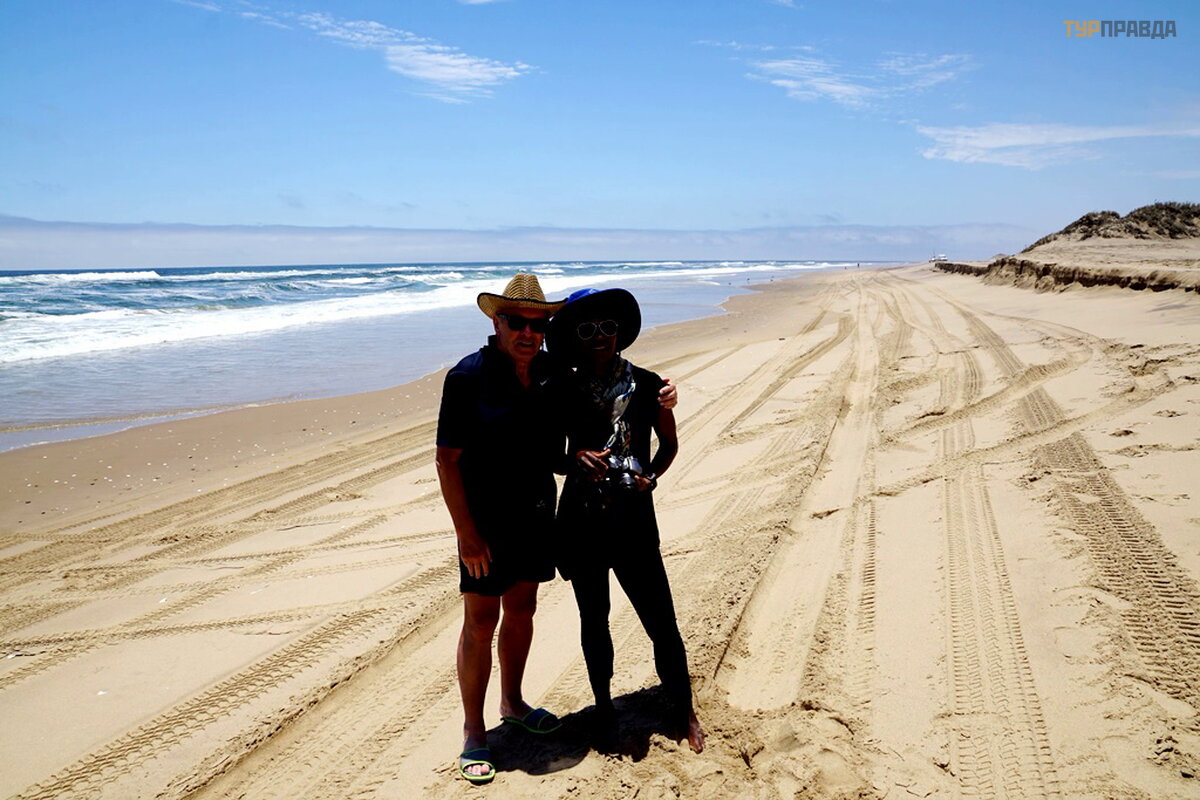Po kelionė s jū ra per Atlantą mano kelionė tę sė si dž ipu į pietus nuo Namibijos 100 kilometrų . Važ iavome daugiau nei valandą tiesiai palei Atlantą smė lė tu krantu. Nuostabus automobilis Nissan. Pakeliui sustojome penkių minuč ių apž valgai. Kelyje buvo vieniš os katė s. Kai jiems buvo praneš ta, jie atsakė nepatenkinti. Buvome suporuoti su kitu „Nissan“. Vairuotojai nuolat palaikydavo ryš į radijo ryš iu, juokaudavo vienas su kitu. Namibijos smė lio peizaž ai – nepaprasti. Penkias valandas keliavome per Namibijos smė lį ir kopas. Nusileidimai nuo kopų buvo labai baisū s. Automobilis tapo beveik vertikalus, o paskui trū ktelė jo ž emyn ir aukš tyn. Po trijų valandų sustojome pietauti š ampano. Naujieji metai tę sė si. Vė l teko iš gerti pusantro butelio š ampano, kurio skonis geras. Tarp merginų buvau vienas, tad š ampaną teko gerti visiems vienam. Kai temperatū ra aukš tesnė nei + 40 laipsnių , š altas š ampanas ir net skanus geriamas lengvai ir daug. Už kandž iai buvo gausū s, skanū s ir į vairū s. Š is piknikas buvo skirtas paskutiniam sustojimui palei Atlanto vandenyno pakrantę . Tada mū sų kelias ė jo atgal per Namibijos smė lio kopas.