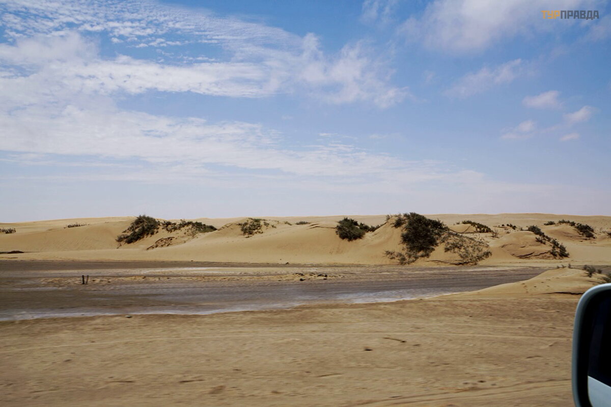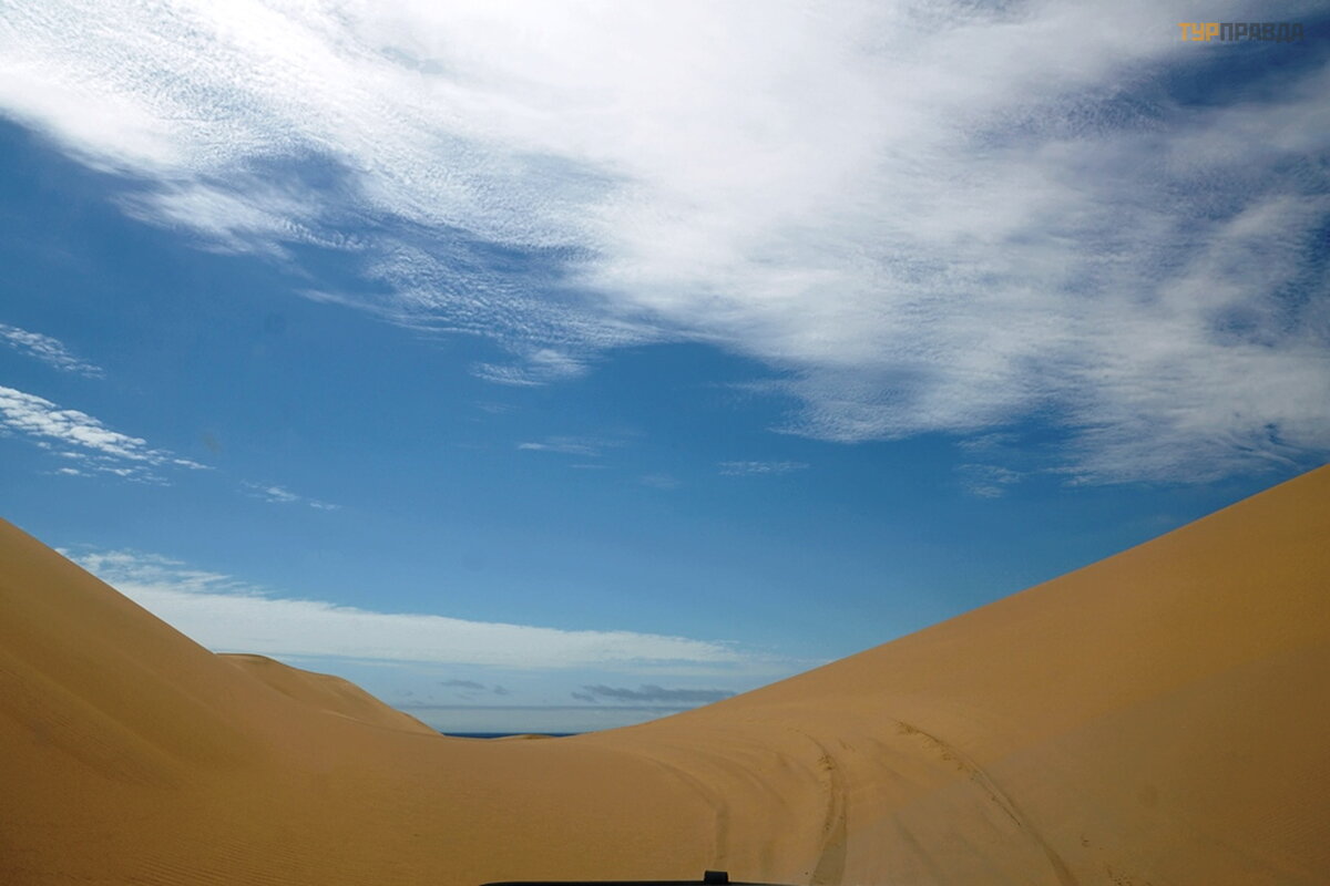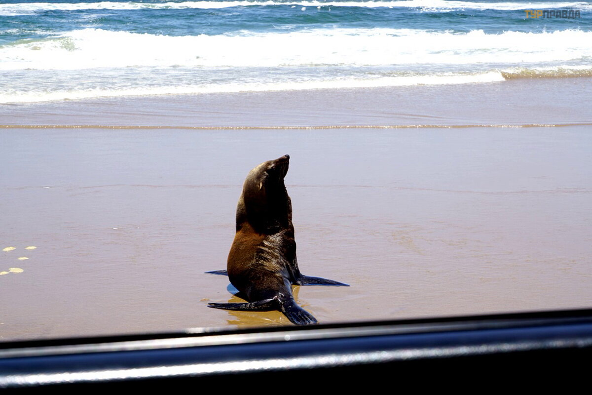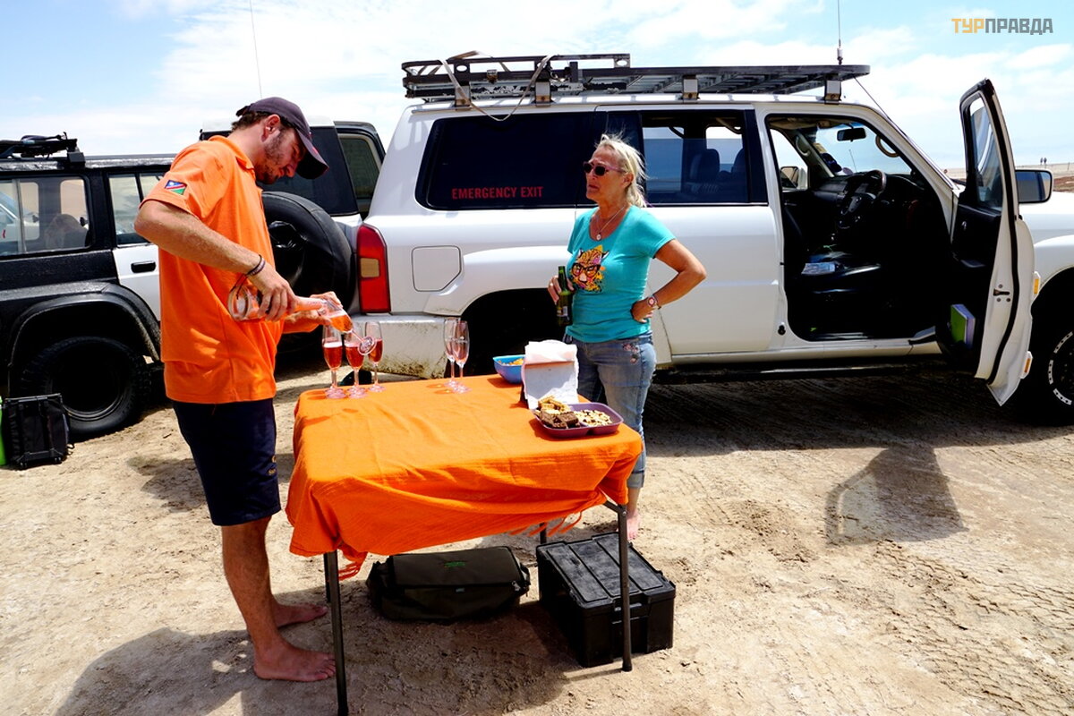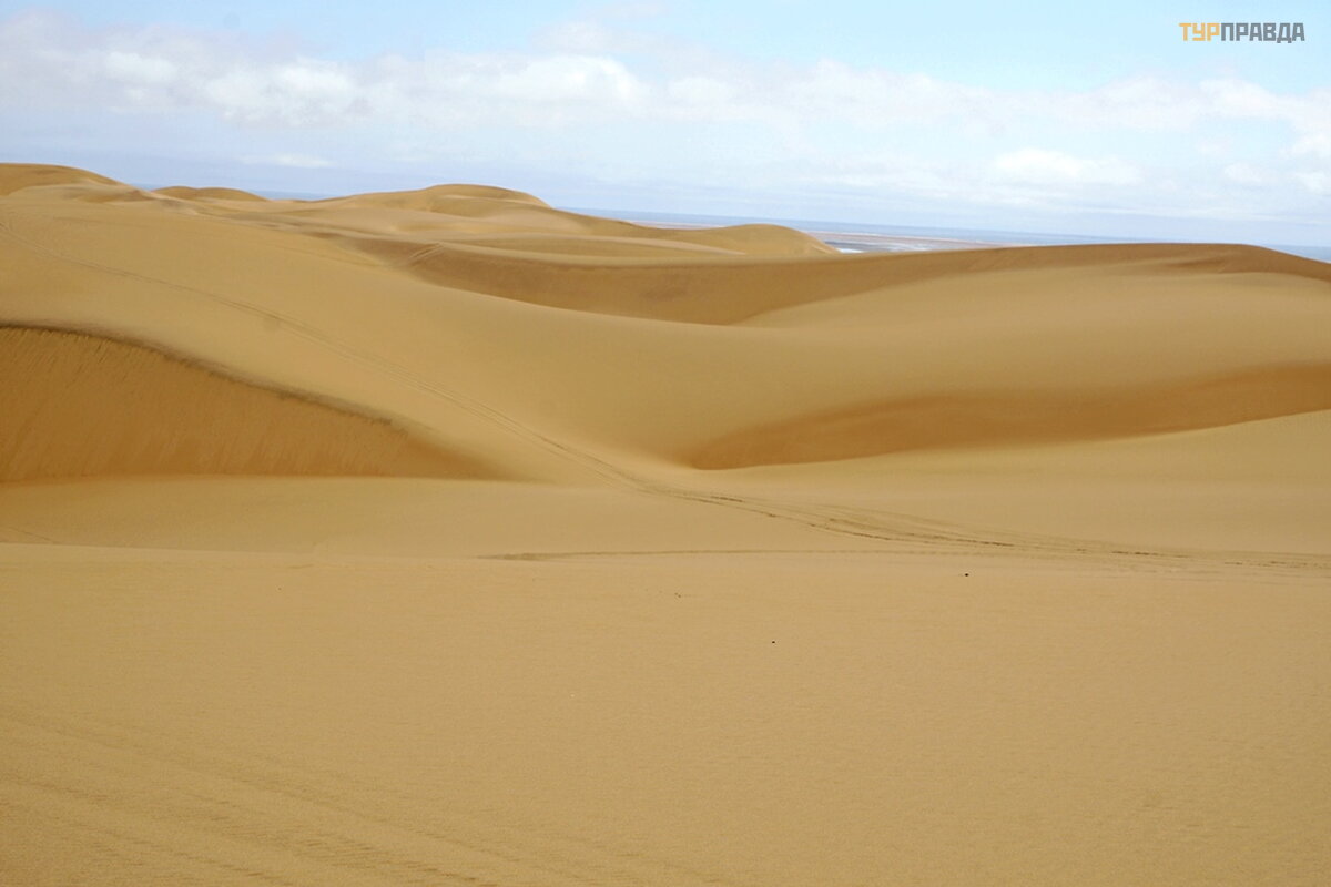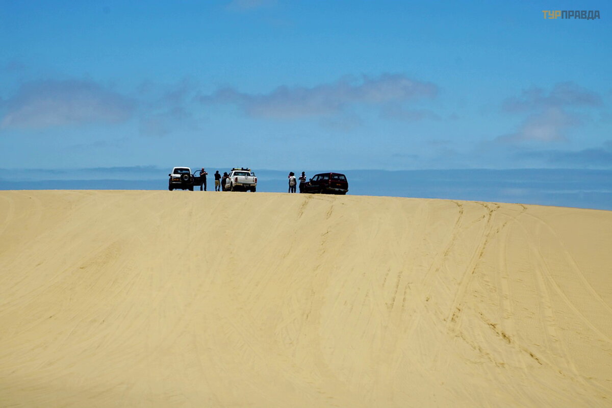 Po kelionė s jū ra per Atlantą mano kelionė tę sė si dž ipu į pietus nuo Namibijos 100 kilometrų . Važ iavome daugiau nei valandą tiesiai palei Atlantą smė lė tu krantu. Nuostabus automobilis Nissan. Pakeliui sustojome penkių minuč ių apž valgai. Kelyje buvo vieniš os katė s. Kai jiems buvo praneš ta, jie atsakė nepatenkinti. Buvome suporuoti su kitu „Nissan“. Vairuotojai nuolat palaikydavo ryš į radijo ryš iu, juokaudavo vienas su kitu. Namibijos smė lio peizaž ai – nepaprasti. Penkias valandas keliavome per Namibijos smė lį ir kopas. Nusileidimai nuo kopų buvo labai baisū s. Automobilis tapo beveik vertikalus, o paskui trū ktelė jo ž emyn ir aukš tyn. Po trijų valandų sustojome pietauti š ampano. Naujieji metai tę sė si. Vė l teko iš gerti pusantro butelio š ampano, kurio skonis geras. Tarp merginų buvau vienas, tad š ampaną teko gerti visiems vienam. Kai temperatū ra aukš tesnė nei + 40 laipsnių , š altas š ampanas ir net skanus geriamas lengvai ir daug. Už kandž iai buvo gausū s, skanū s ir į vairū s. Š is piknikas buvo skirtas paskutiniam sustojimui palei Atlanto vandenyno pakrantę . Tada mū sų kelias ė jo atgal per Namibijos smė lio kopas.