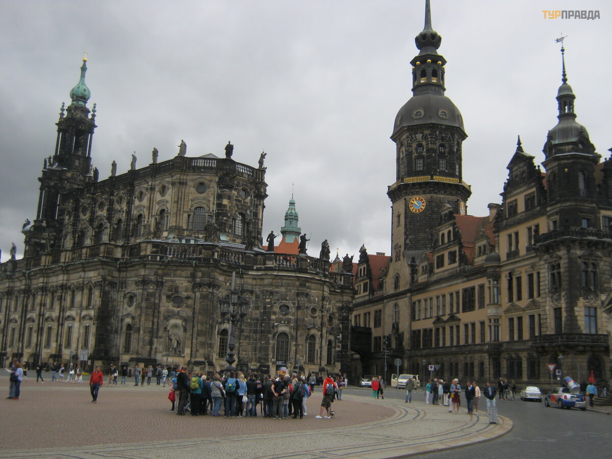 До ближайшего отеля по нашему маршруту в городе Легница остается проехать всего ничего – 75 км. . Город Легница в вечерней подсветке очень красивый и романтичный. Жаль, что в дневное время у нас времени на него совсем нет. Часы на городской ратуше всю ночь очень мелодично отсчитывают каждый час. Хотелось бы там задержаться, но у нас выезд в 8 утра, мы едем в Дрезден, до которого еще 200 км. Додремав в автобусе, к 11 утра приезжаем в Дрезден – столицу Саксонии, и сразу же на обзорную экскурсию. Город встречает нас мрачным небом и температурой +16 (26 июля! ). Но, слава Богу, дождя пока нет.